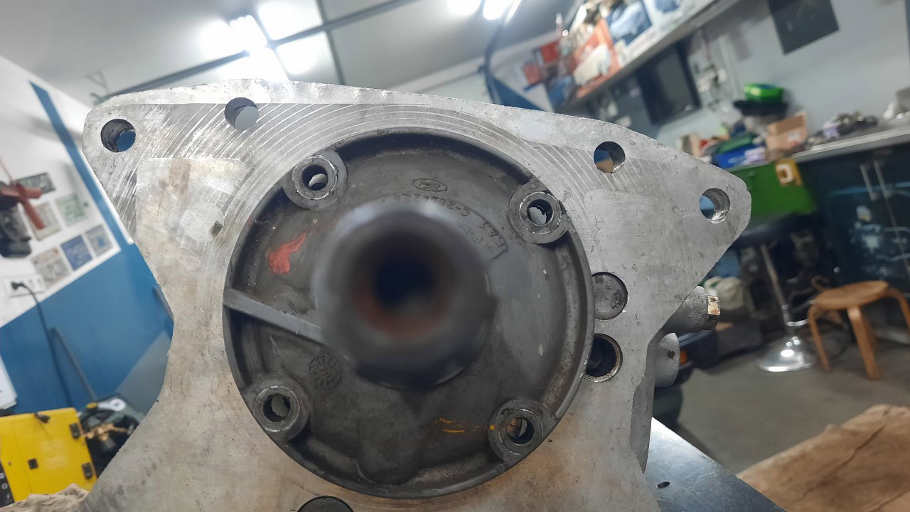 Nie pasują średnice pod łożysko przednie i rozstaw otworów. Najprościej byłoby chyba dotoczyć taki element od nowa, ale dopiero po przymiarce do docelowego sprzęgła - po tym ryjku przesuwa się łożysko wyciskowe sprzęgła, i warto, żeby ryjek miał właściwą długość. Dlatego na razie to zostawimy.