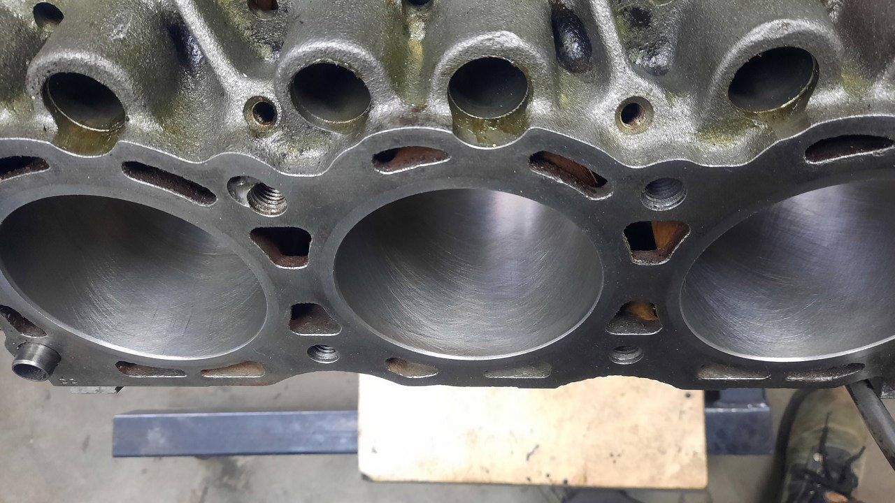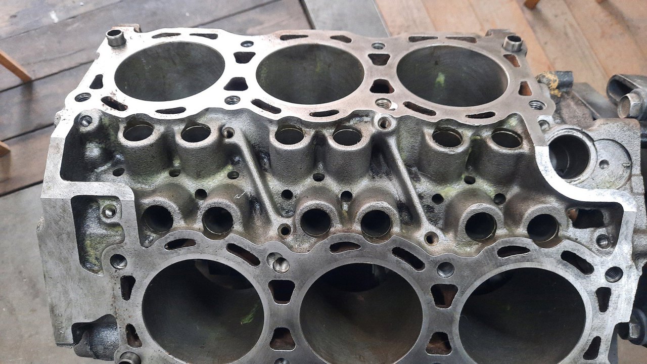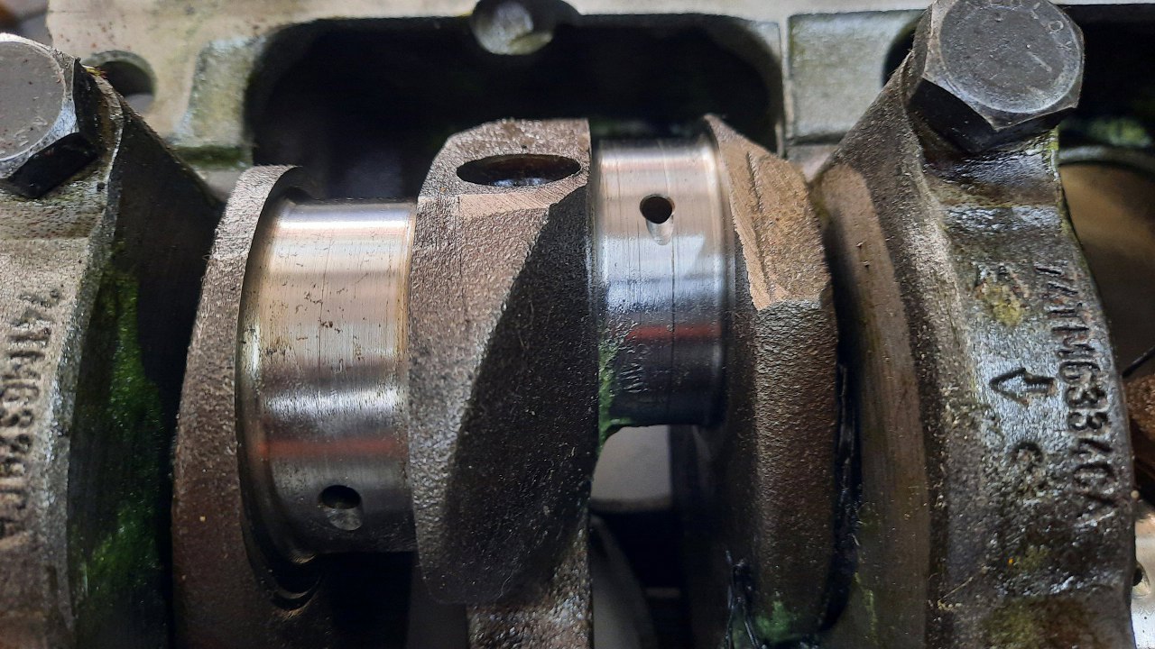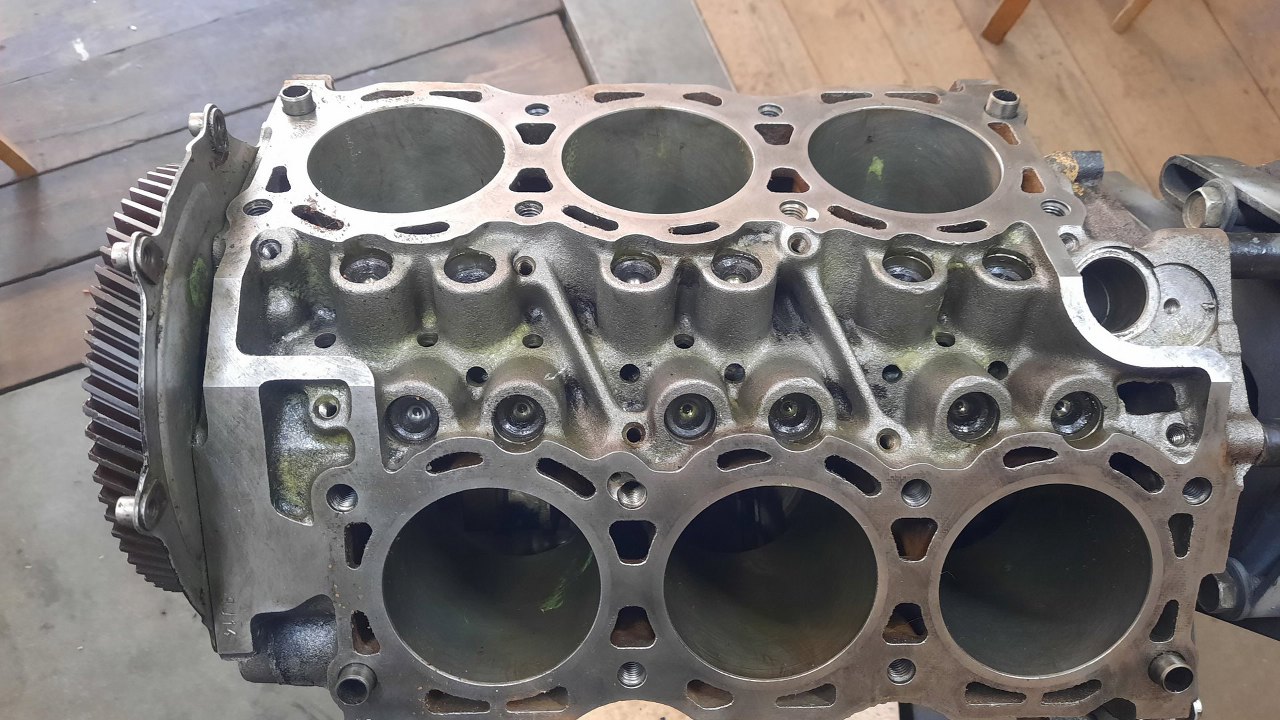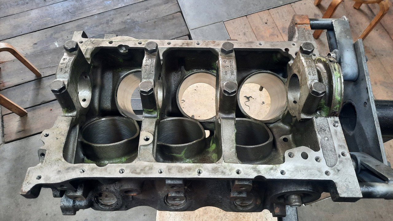 Po pomierzeniu wszystkich sześciu cylindrów z podobnym rezultatem, podjąłem decyzję o tulejowaniu bloku. Gdyby nie nowe tłoki, to pewnie poszedłbym inną drogą, ale skoro tłoki już są, to tak będzie jednak prościej. Przykręciłem stopy wału do bloku, żeby dostarczyć to tak do szlifierni.