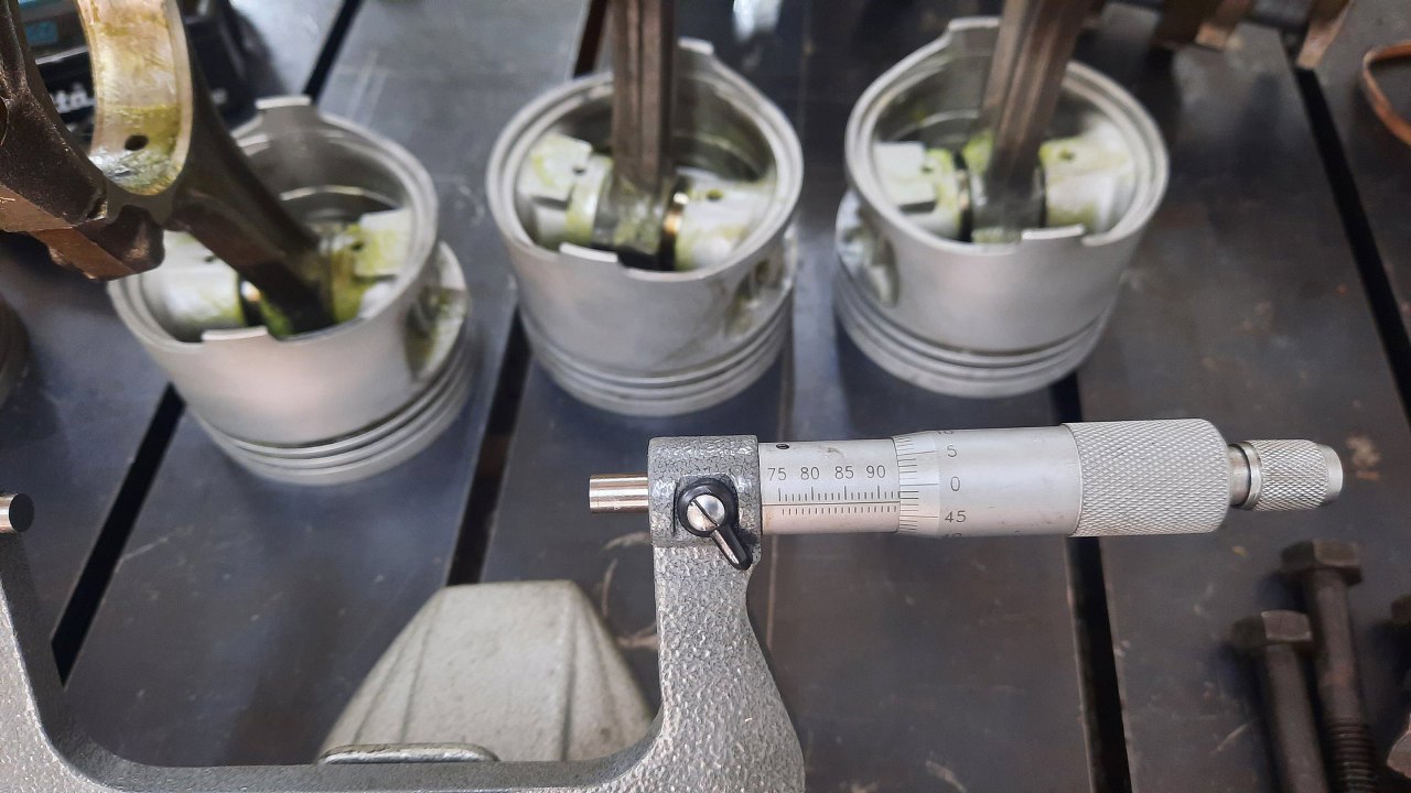 Tłoki (oprócz jednego) też wyglądają na nowe. W sumie są, tylko chyba kiedyś coś się z jednym z nich stało (będzie to widać później, przy okazji zdjęć ze składania silnika). Coś mnie jednak tknęło i zmierzyłem tłoki. Mają nominalny wymiar 92,98mm, czyli nie są nadwymiarowe.