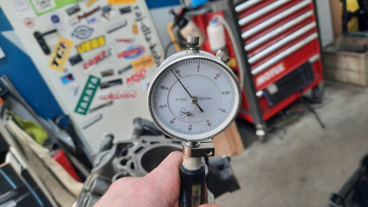 Po ustawieniu średnicówki na wymiar tłoka, mogłem zmierzyć cylinder, a właściwie różnicę wymiarów tłoka i cylindra. Powinna się mieścić w zakresie 0,04 - 0,06mm, tymczasem mamy różnicę 0,12. To sporo za dużo. Wygląda na to, że ktoś liczył na to, że to tłoki były zużyte i je wymienił, robiąc tylko honowanie cylindrów. To niestety tak nie działa - to cylindry się zużywają...