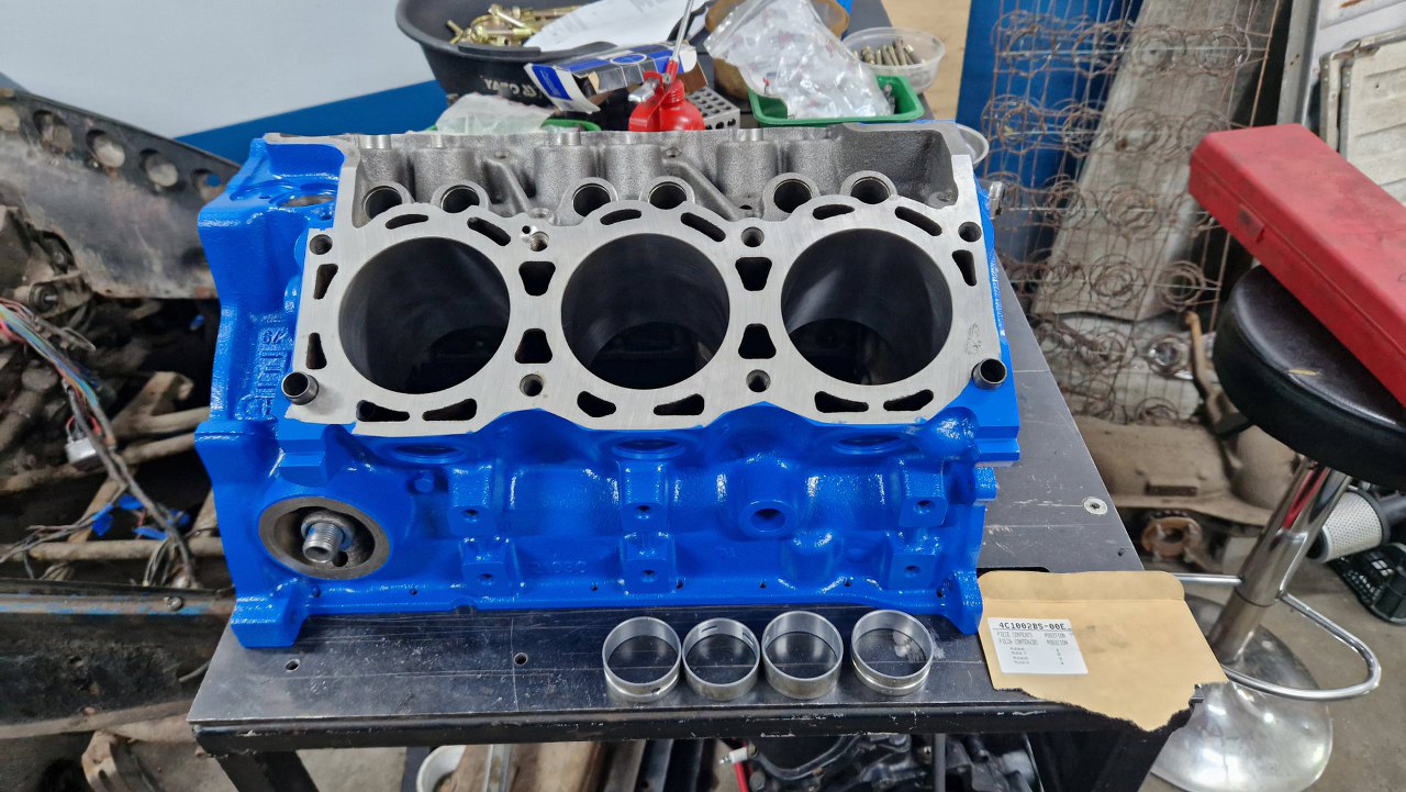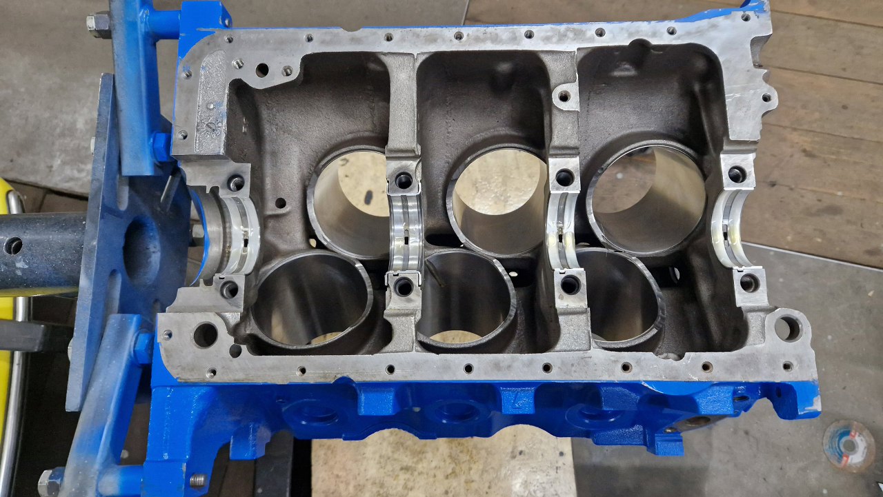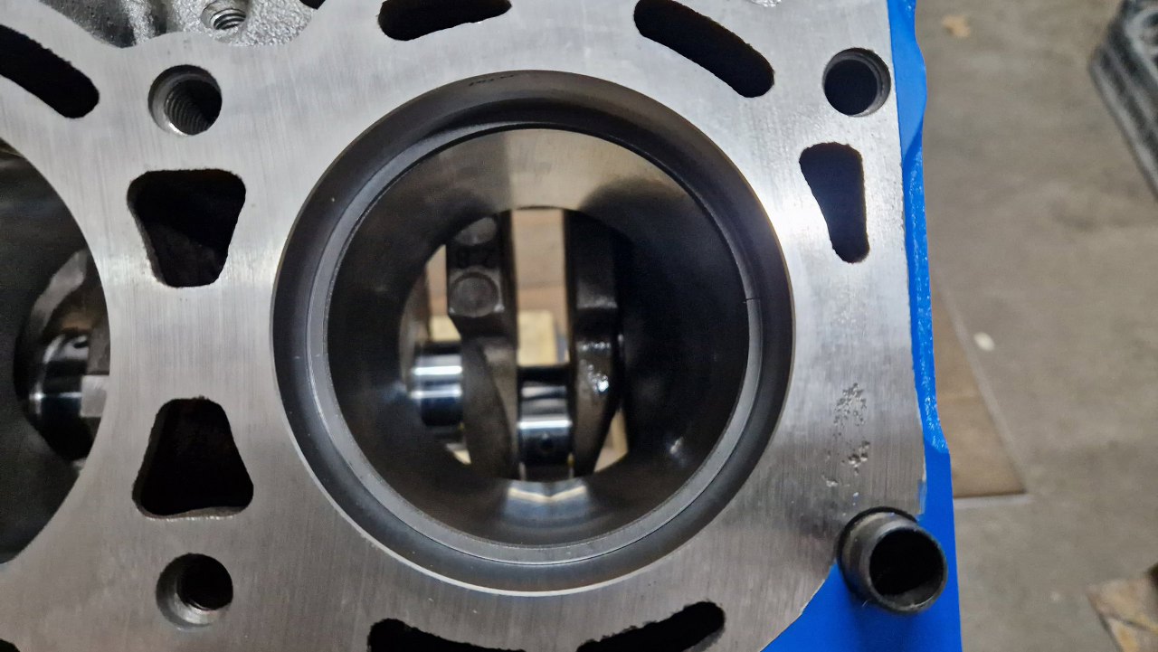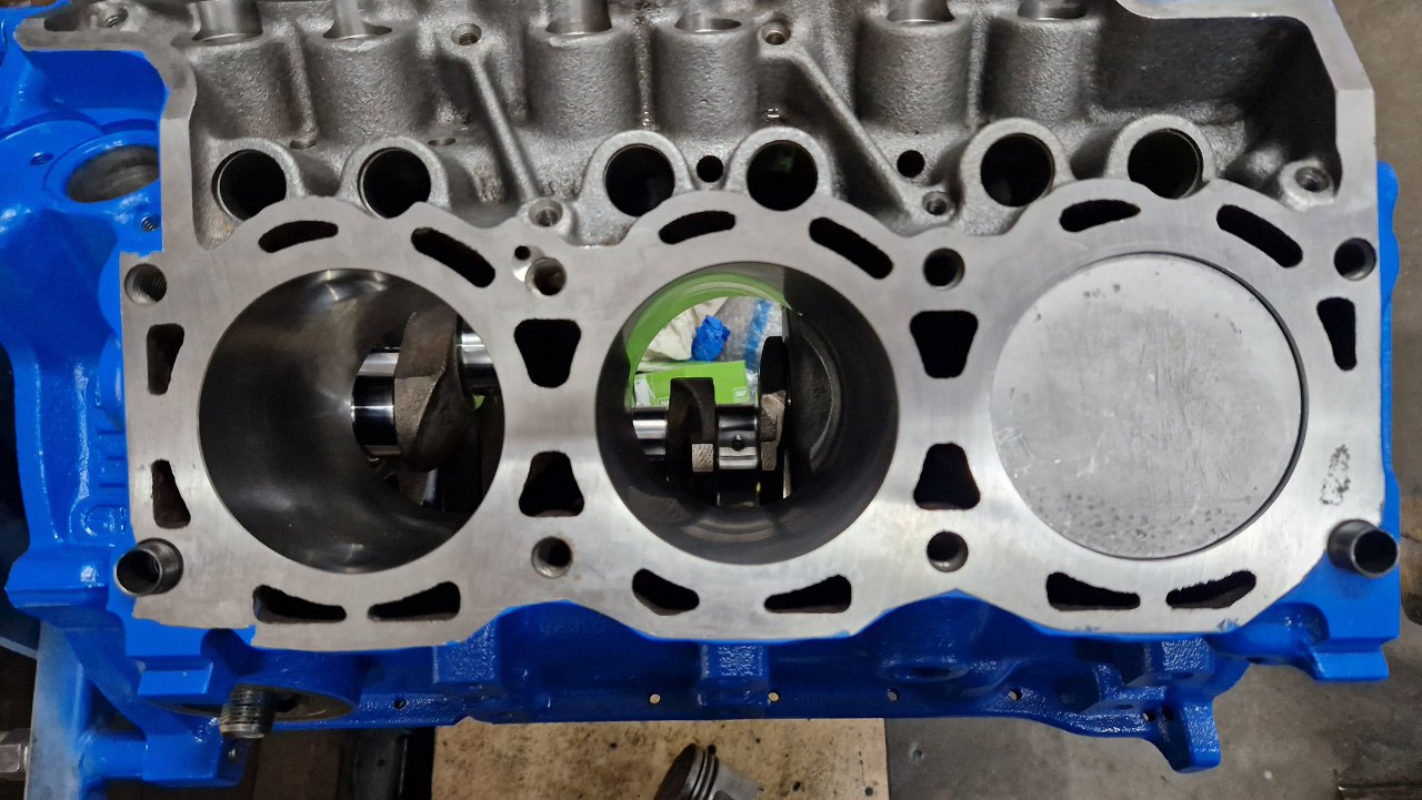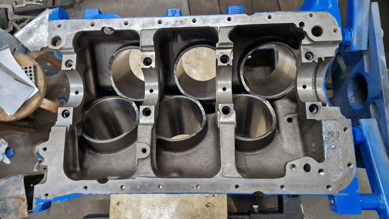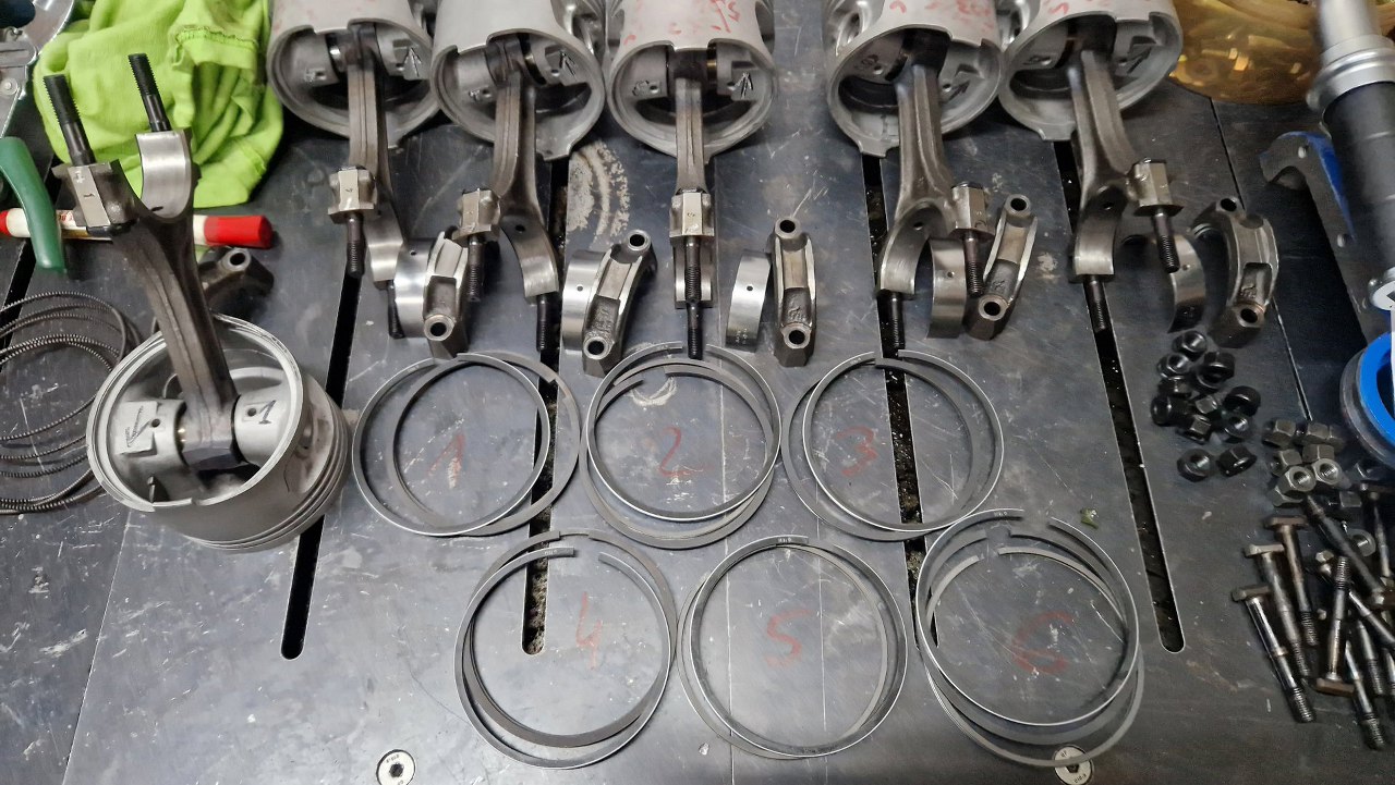 Wszystkie sześć cylindrów ma już swoje tłoki włożone.
