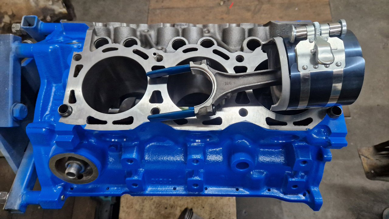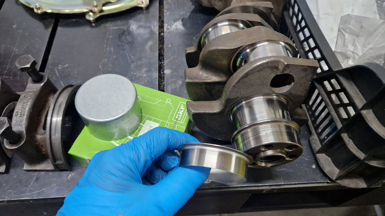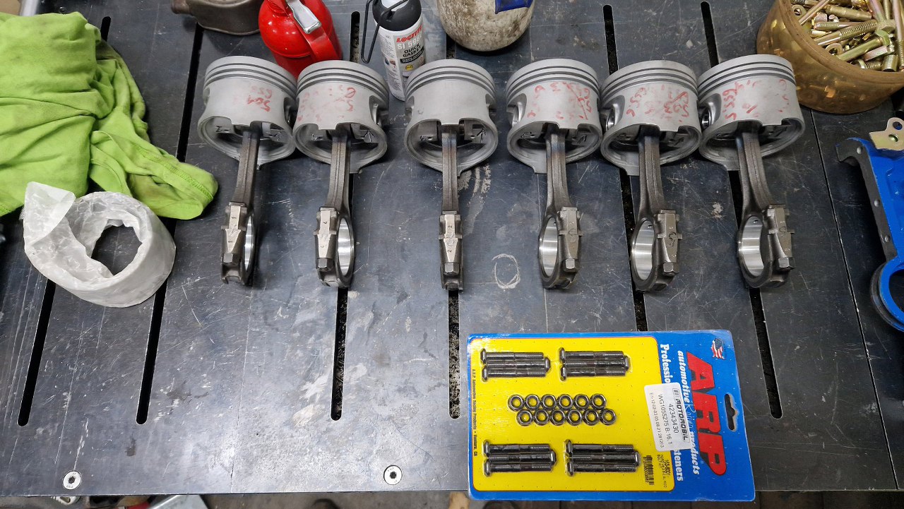 Tłoki zostały w szlifierni założone na korbowody. Ja jeszcze wymienię śruby na mocniejsze, ARPa. Jest plan, żeby ten silnik był trochę mocniejszy, niż seryjny, więc trzeba zadbać, żeby dół silnika to dzielnie zniósł.