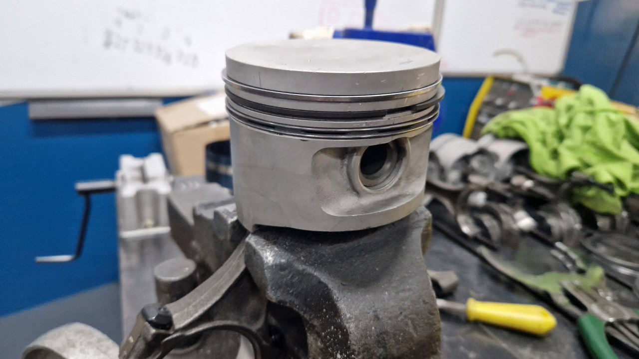 W ten sposób pierwszy tłok trafił do swojego cylindra. To jest ten jeden, jedyny tłok, który wygląda tak samo na nowy, jak reszta, ale ma ślady, jakby pracował w silniku i dostała się do niego jakaś drobna część i go uderzała. Dziwne, bo obwód tłoka nice ma śladu po jego użyciu w silniku. Nic to jednak nie przeszkadza w użyciu tego tłoka w tym silniku.
