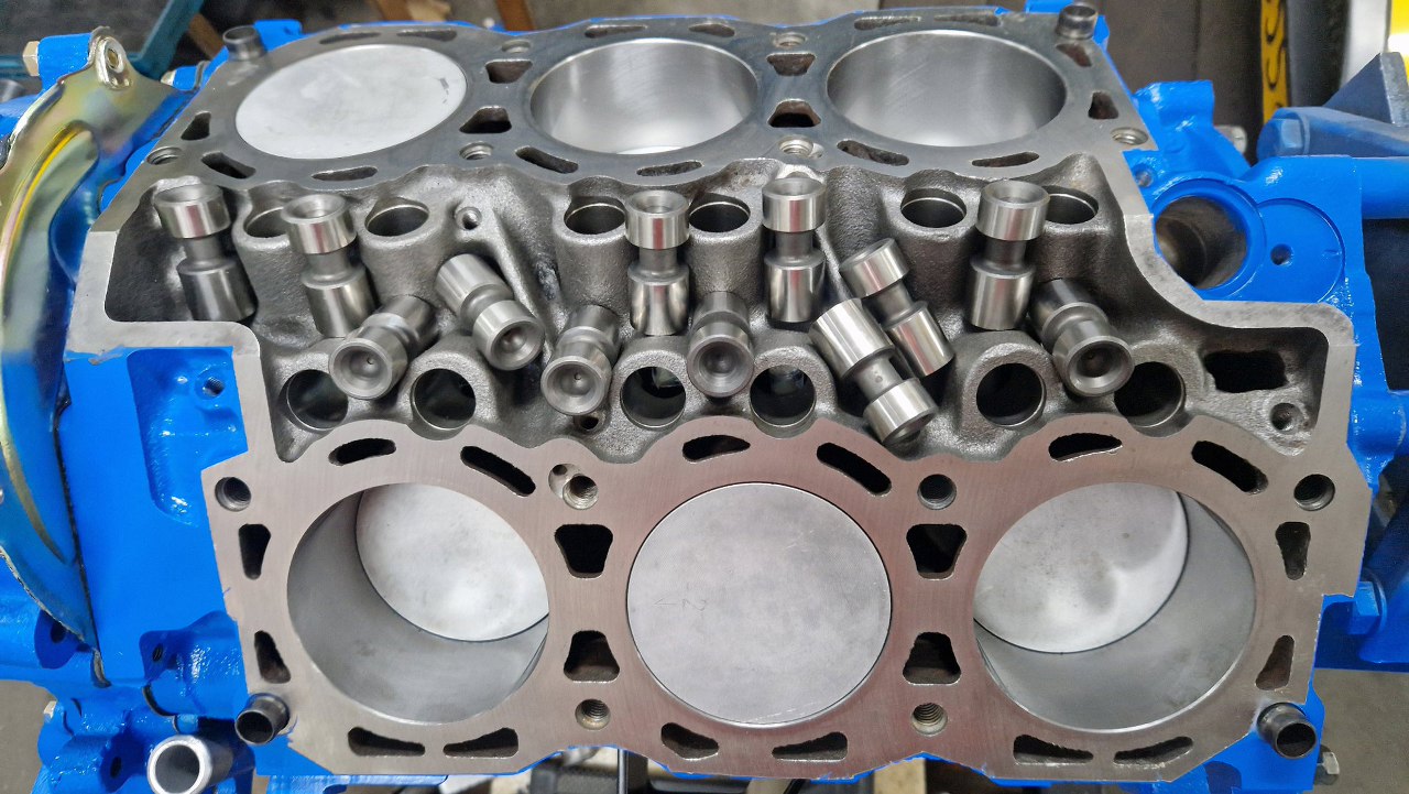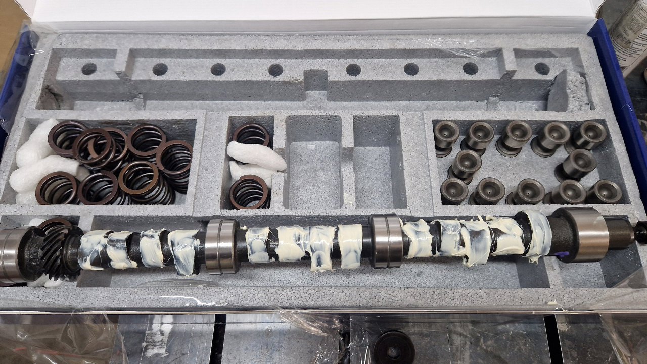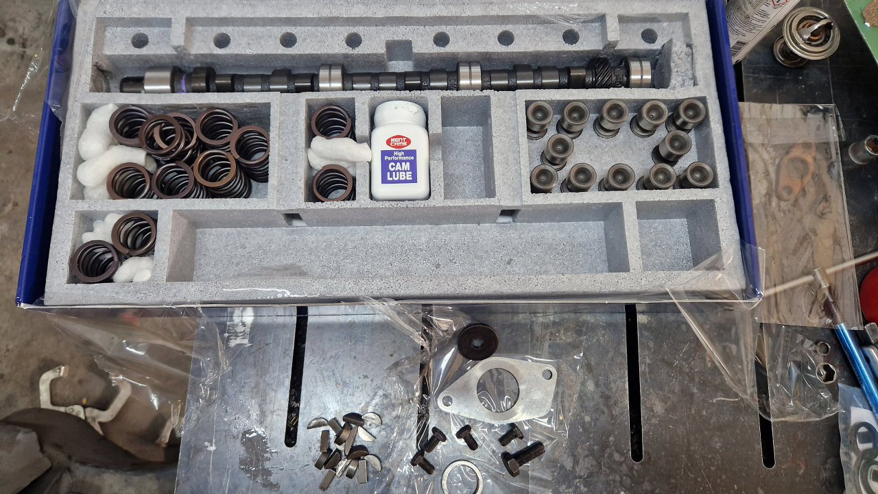 Po złożeniu wału z tłokami doczekałem się też zestawu wałka rozrządu. Zestaw jest Kent Camsa, z wałkiem KCV6T3SB road/rally. Ponieważ jest to dość duży silnik jak na Taunusa, do którego ma to trafić (w końcu w Taunusie największy fabrycznie dostępny silnik to był 2.3 V6), to postawiłem na większy przyrost mocy. Momentu powinno spokojnie wystarczyć. Oczywiście do tego dojdą jeszcze modyfikacje głowic, ale to później. Teraz musimy to włożyć do silnika. Potrzebne będzie kilka drobiazgów widocznych poniżej pudełka.