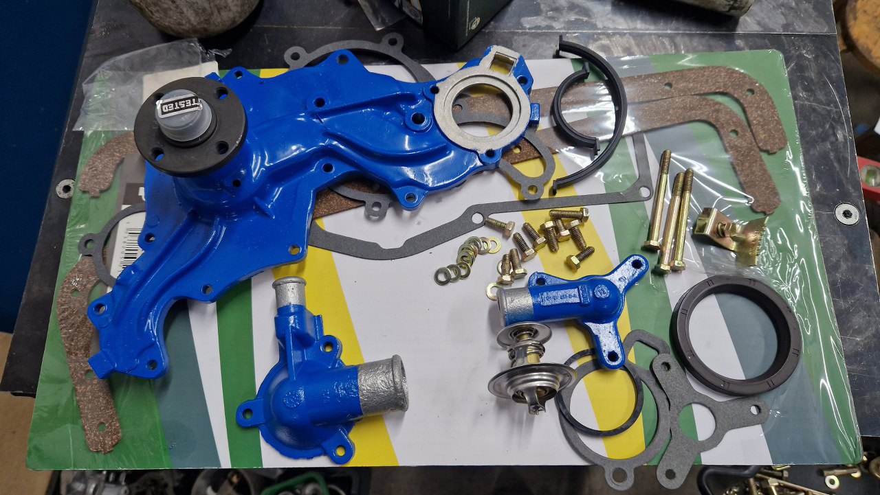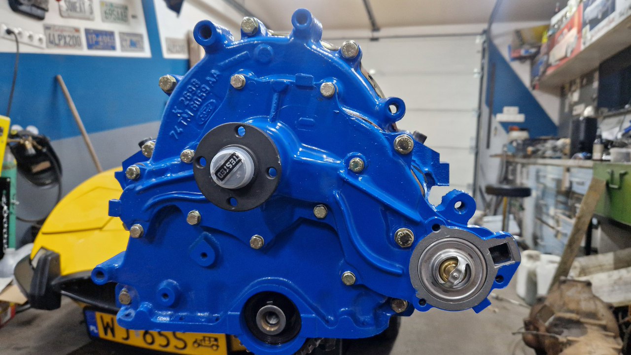 Przygotowałem resztę części przodu - pompę wody i pokrywki termostatu. Pompa wody i termostat są nowe.