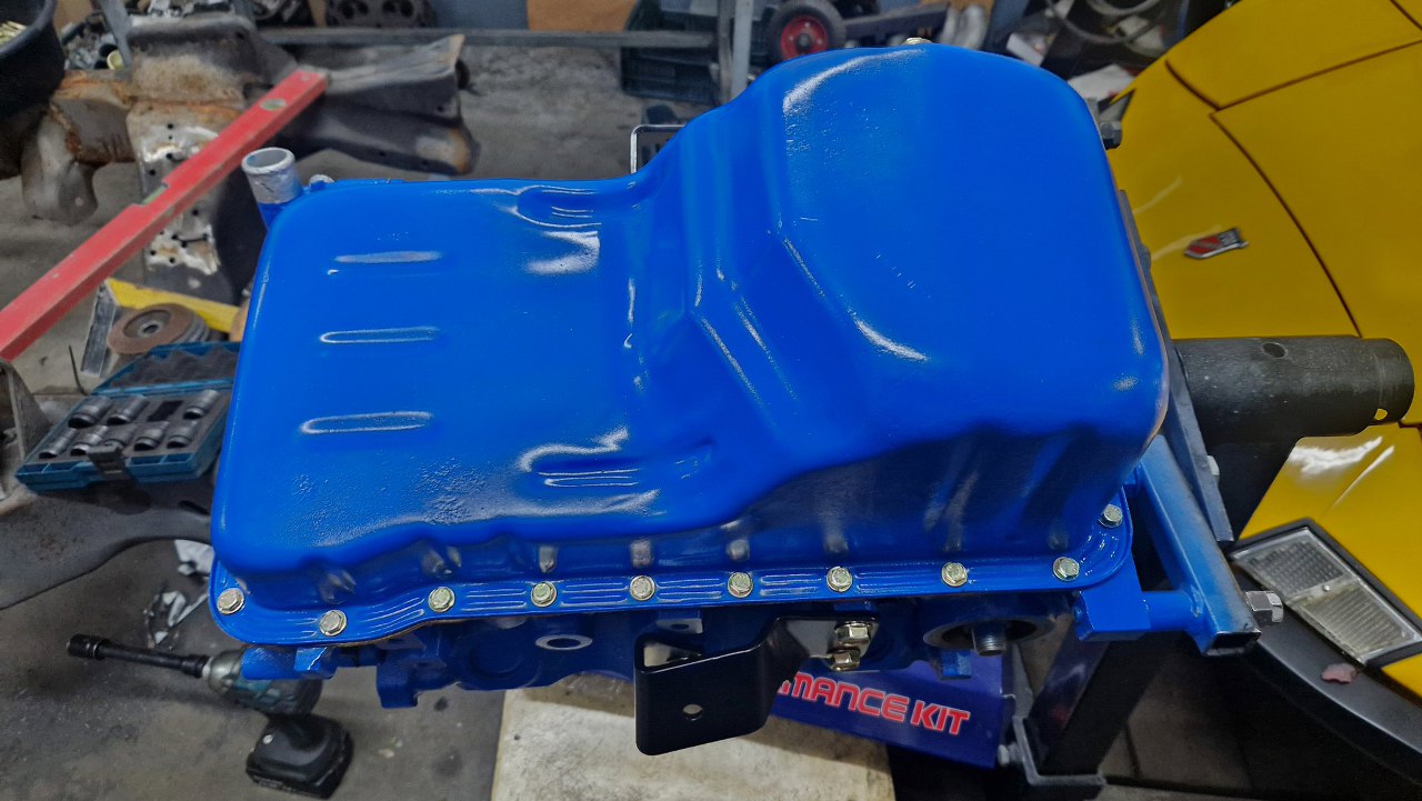 Po zamknięciu przodu silnika mogę też przykręcić miskę oleju. Położyłem na blok uszczelki miski.
