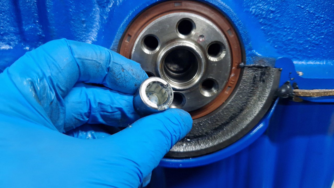 Chciałem przykręcić koło zamachowe, ale najpierw sprawdziłem łożysko pilotujące skrzyni - i dobrze, bo miało wyszczerbioną obudowę. Wyciągnąłem je z wału.