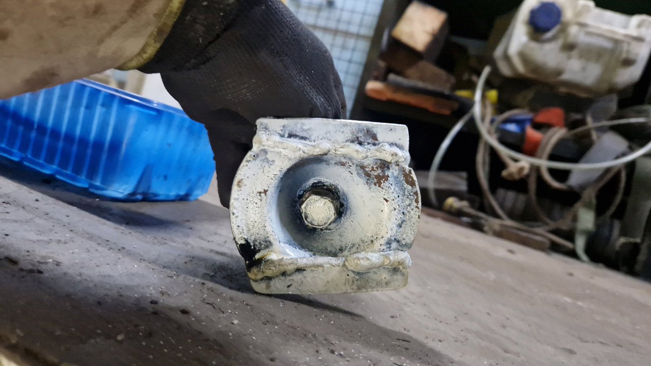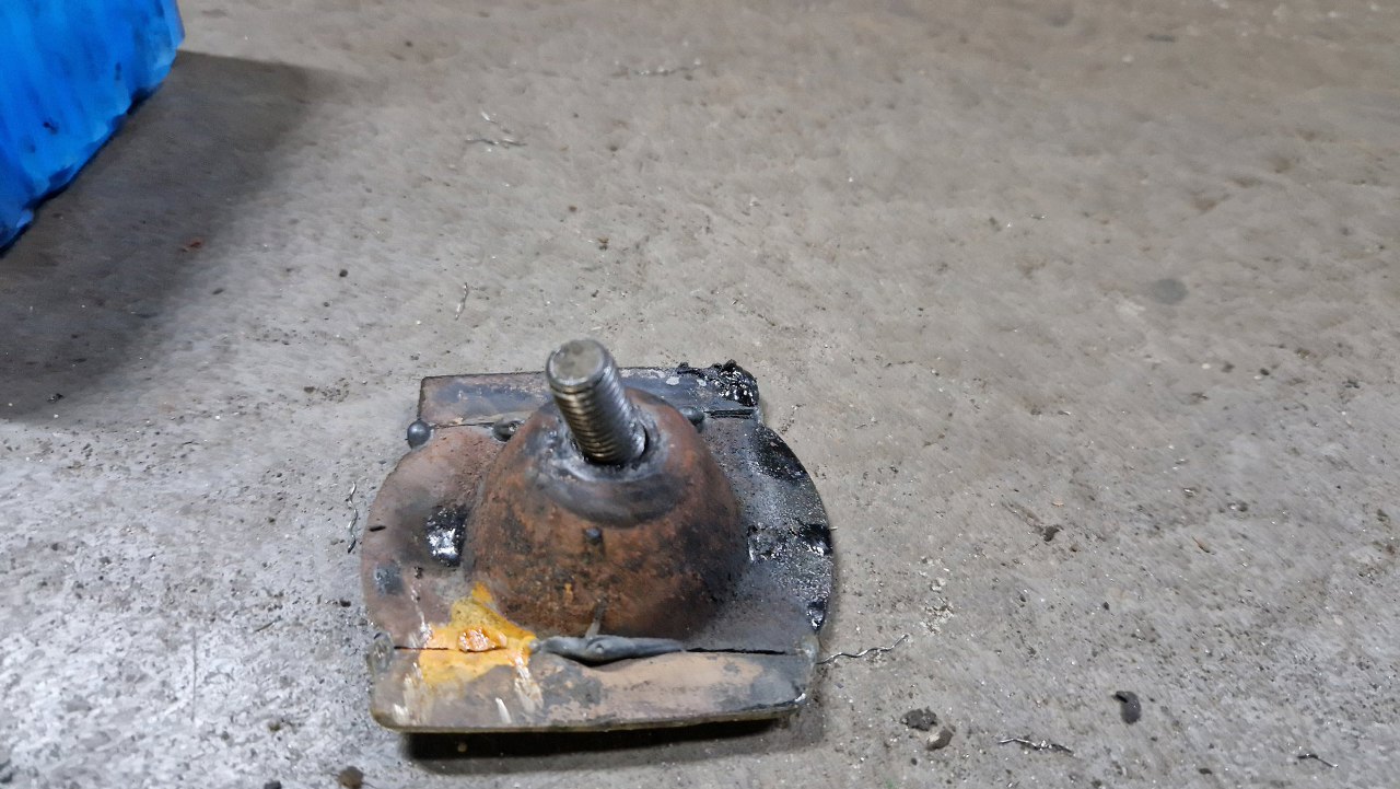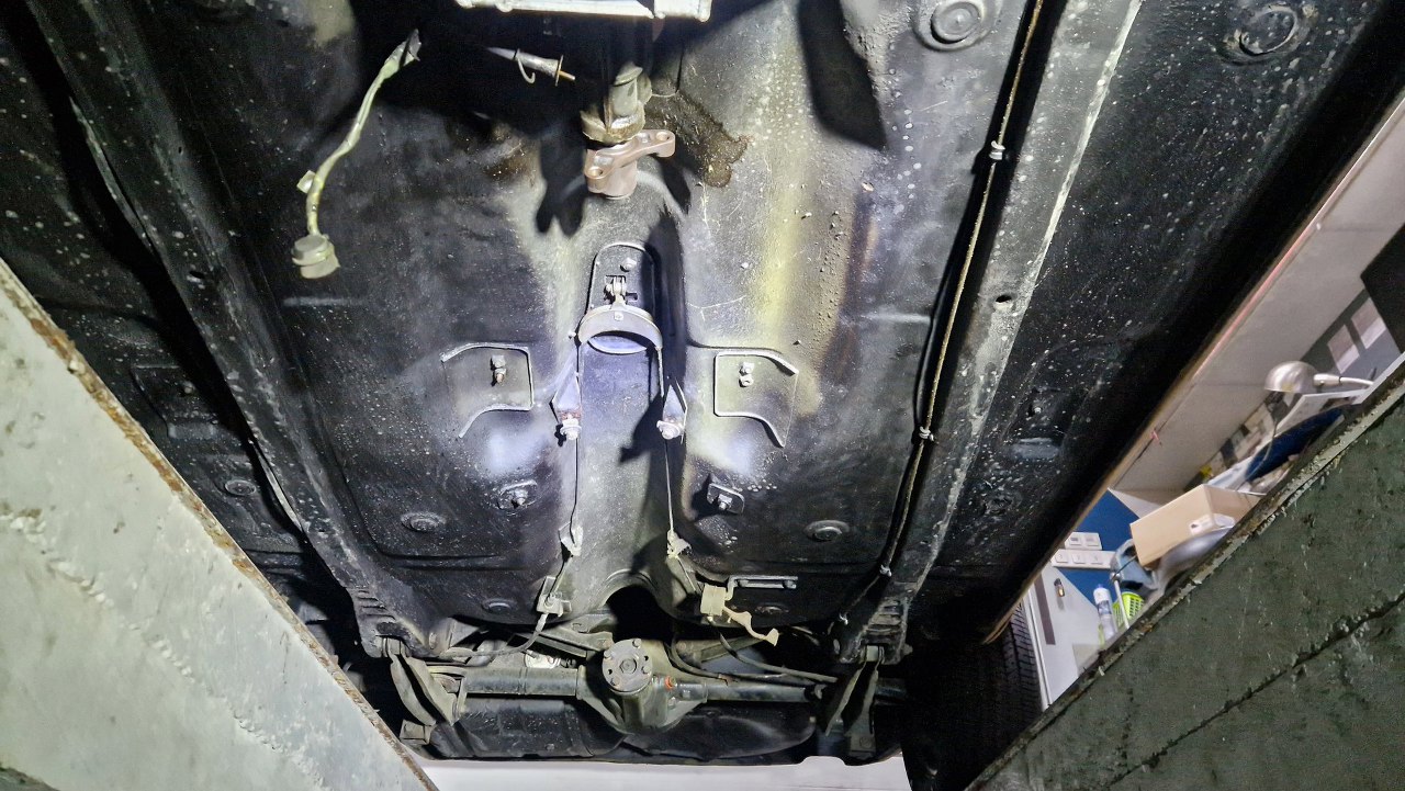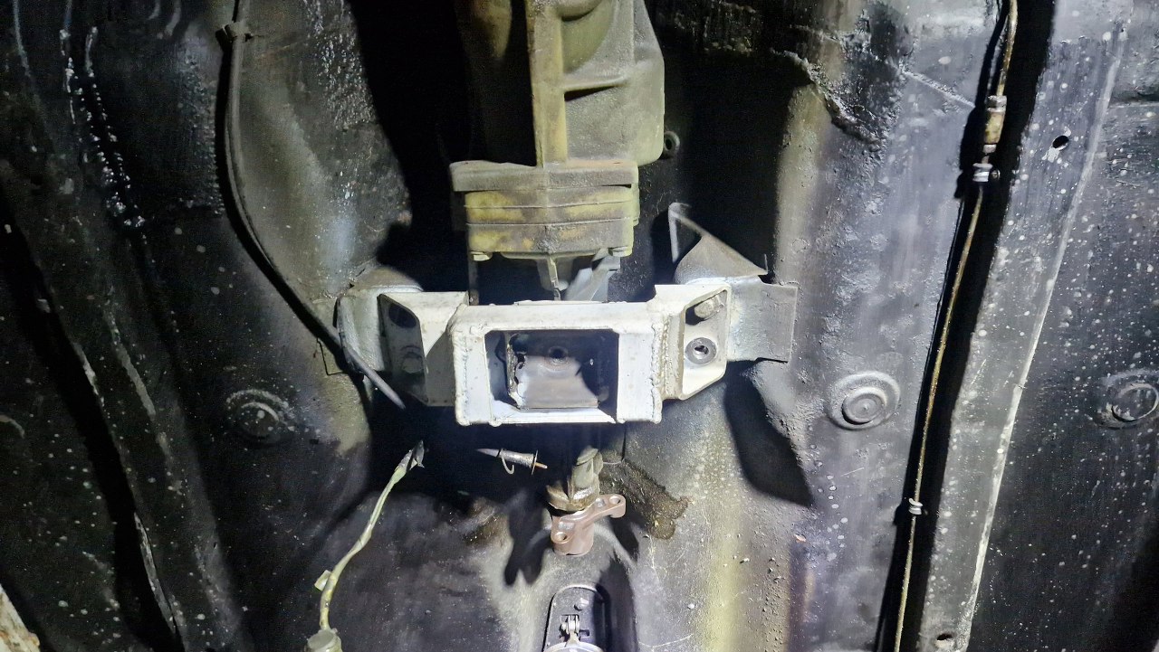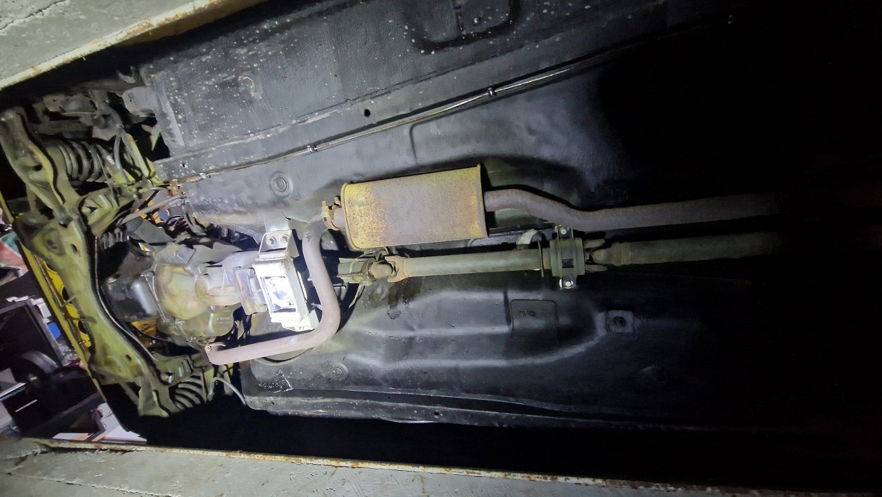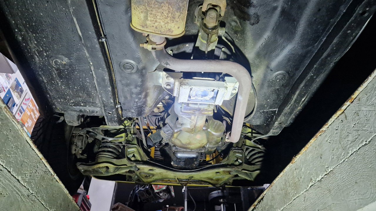 Od spodu samochód jest w nawet niezłym stanie, z wyjątkiem kilku drobnych niefachowych napraw. Ale poza tym - zdrowizna. Stąd muszę wyjąć caly wydech i napęd. Już od razu widać fantazyjnie wykonaną łapę skrzyni.