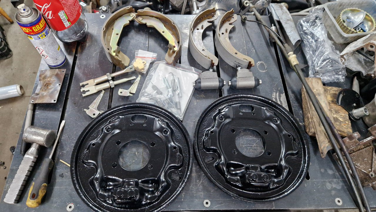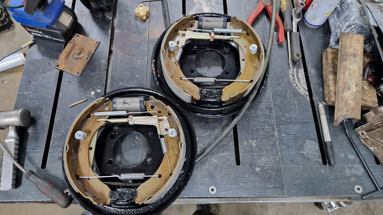 Rozłożyłem sobie potrzebne części na stole - tarcze kotwiczne, szczęki, cylinderki, zestawy montażowe i samoregulatory.