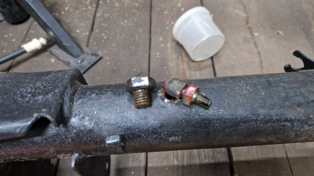 Jest jeszcze jeden, mały problem. Nie ma odpowietrznika. Kiedyś był, ale ktoś zamisat niego wkręcił śrubę. To nie będzie dobrze działało bez odpowietrzenia mostu, więc coś trzeba z tym zrobić.