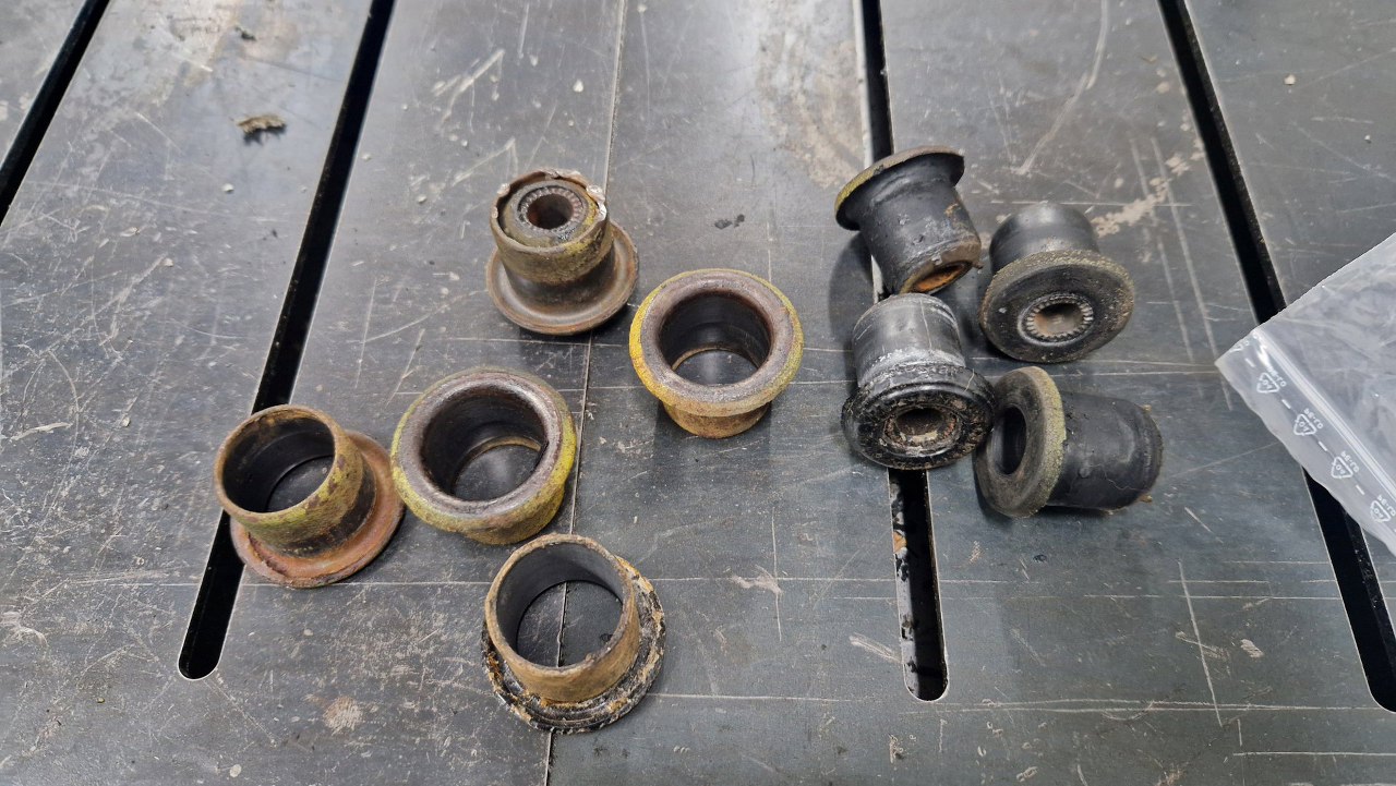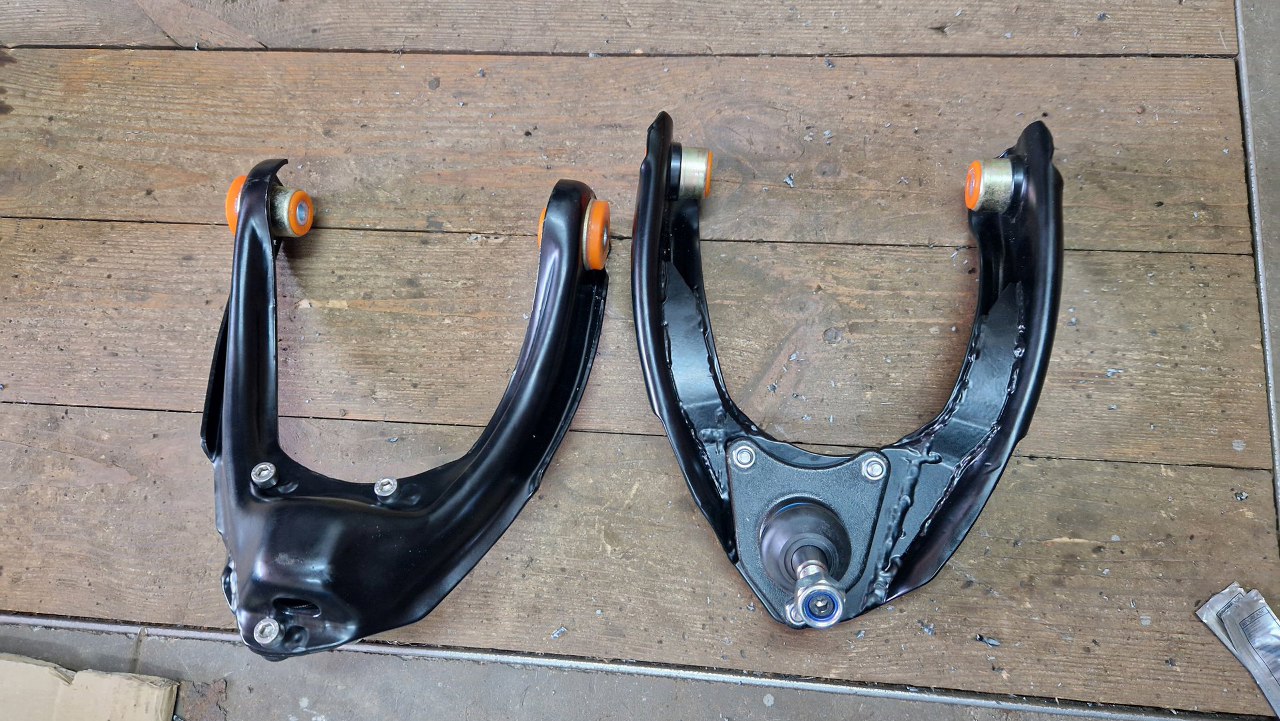 Pozostałe tuleje zewnętrzne oddałem do ocynku, bo potrzebne były do poliuretanów - one nie miały w zestawie zewnętrznych części. Przykręciłem też sworznie. Punkty mocowania sworzni zostały przespawane, żeby popawić geometrię zawieszenia, a dokładniej kąt pochylenia sworznia zwrotnicy.