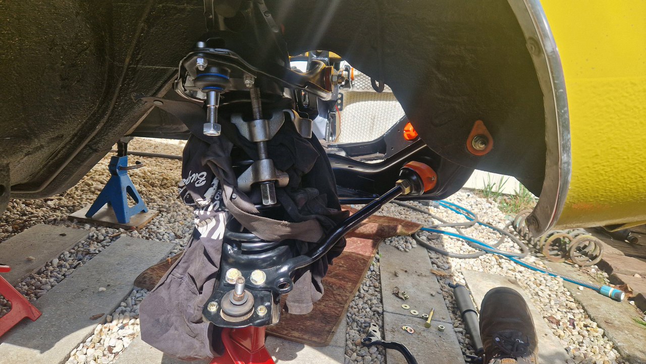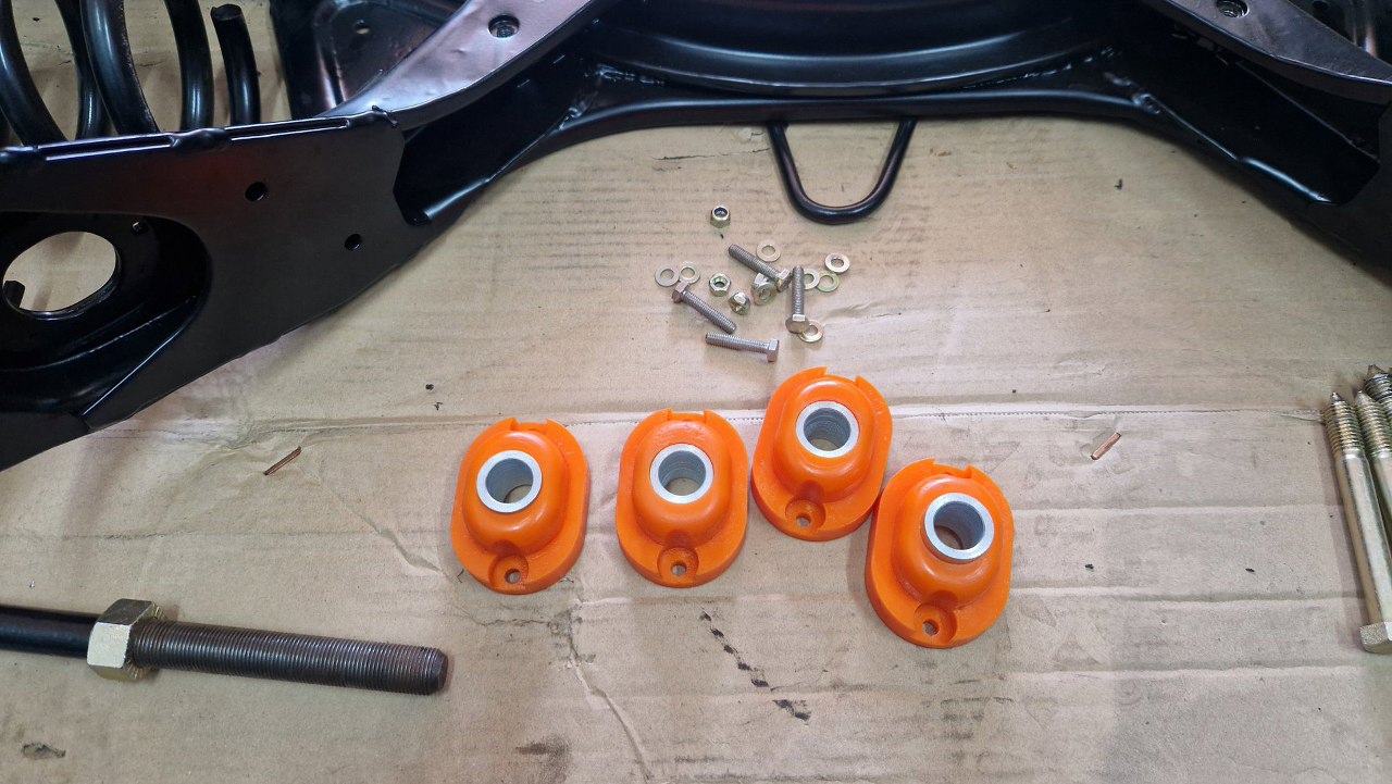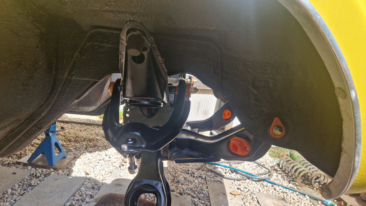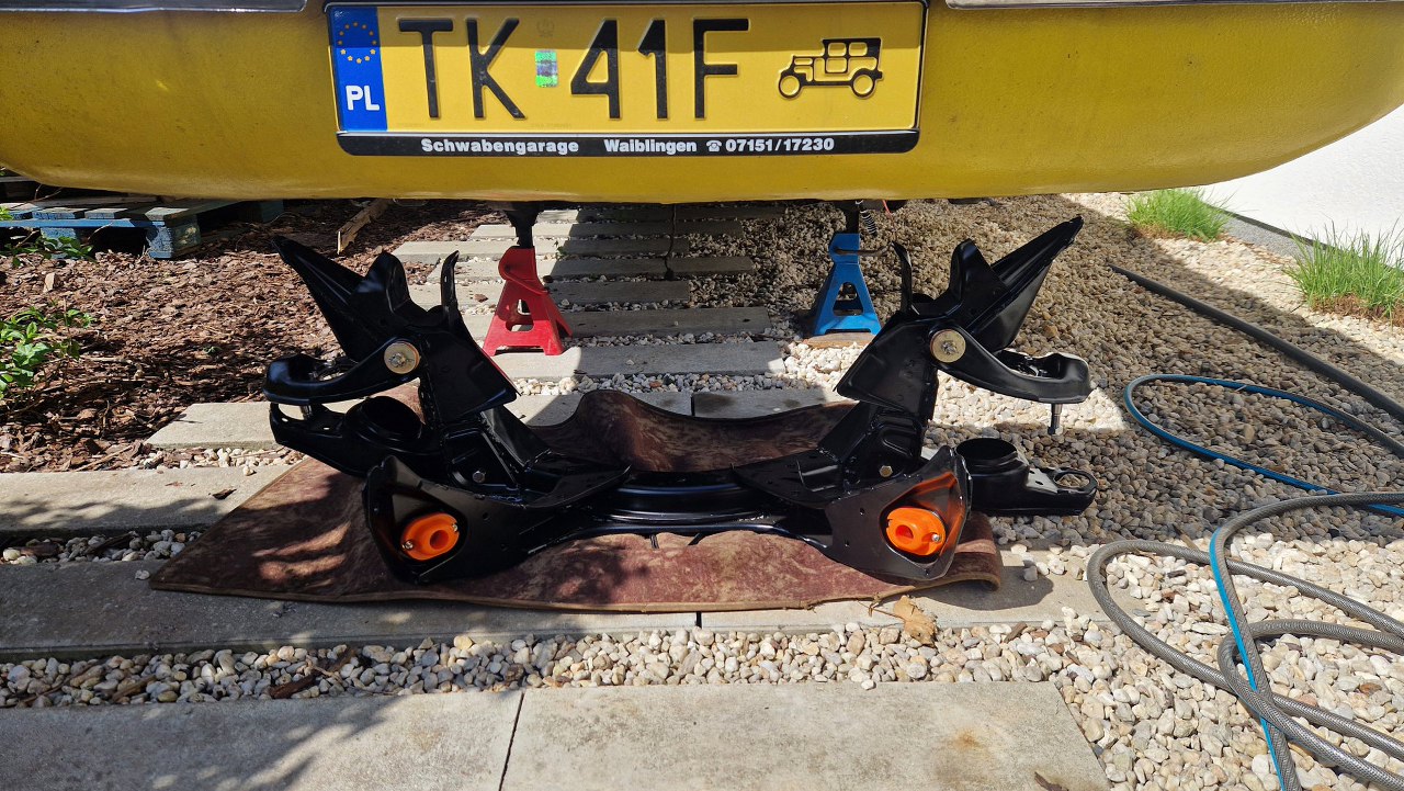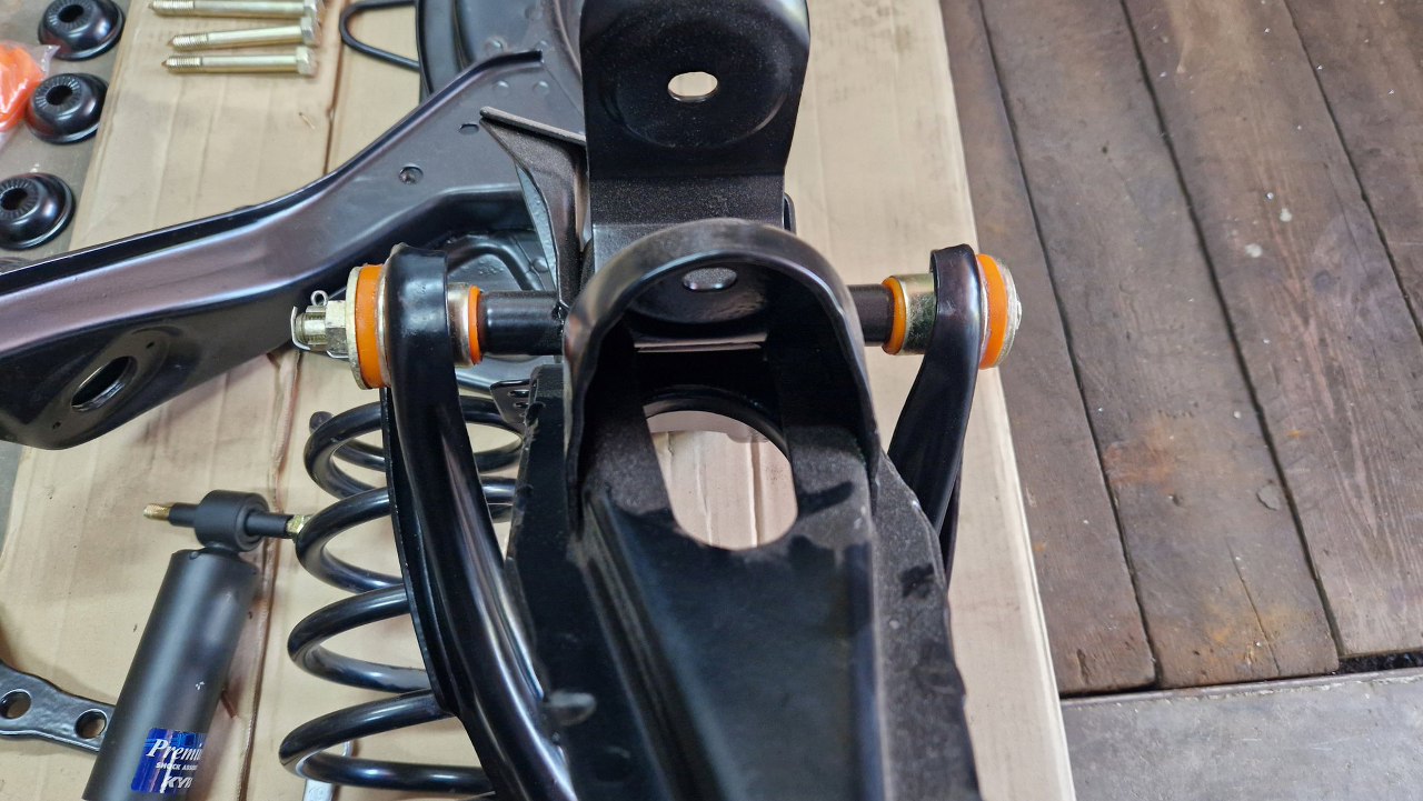 Założyłem wahacze na belkę i przykręciłem. Plus poliuretanów jest taki, że nie trzeba czekać z dokręcaniem śrub na postawienie samochodu na koła z silnikiem itd. - poliuretany pracują jak łożyska, a nie jak gumy, na skręcanie.