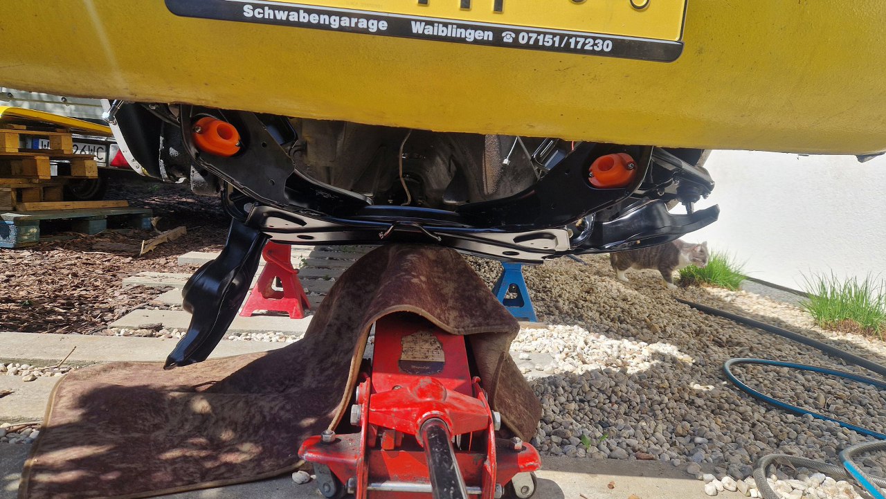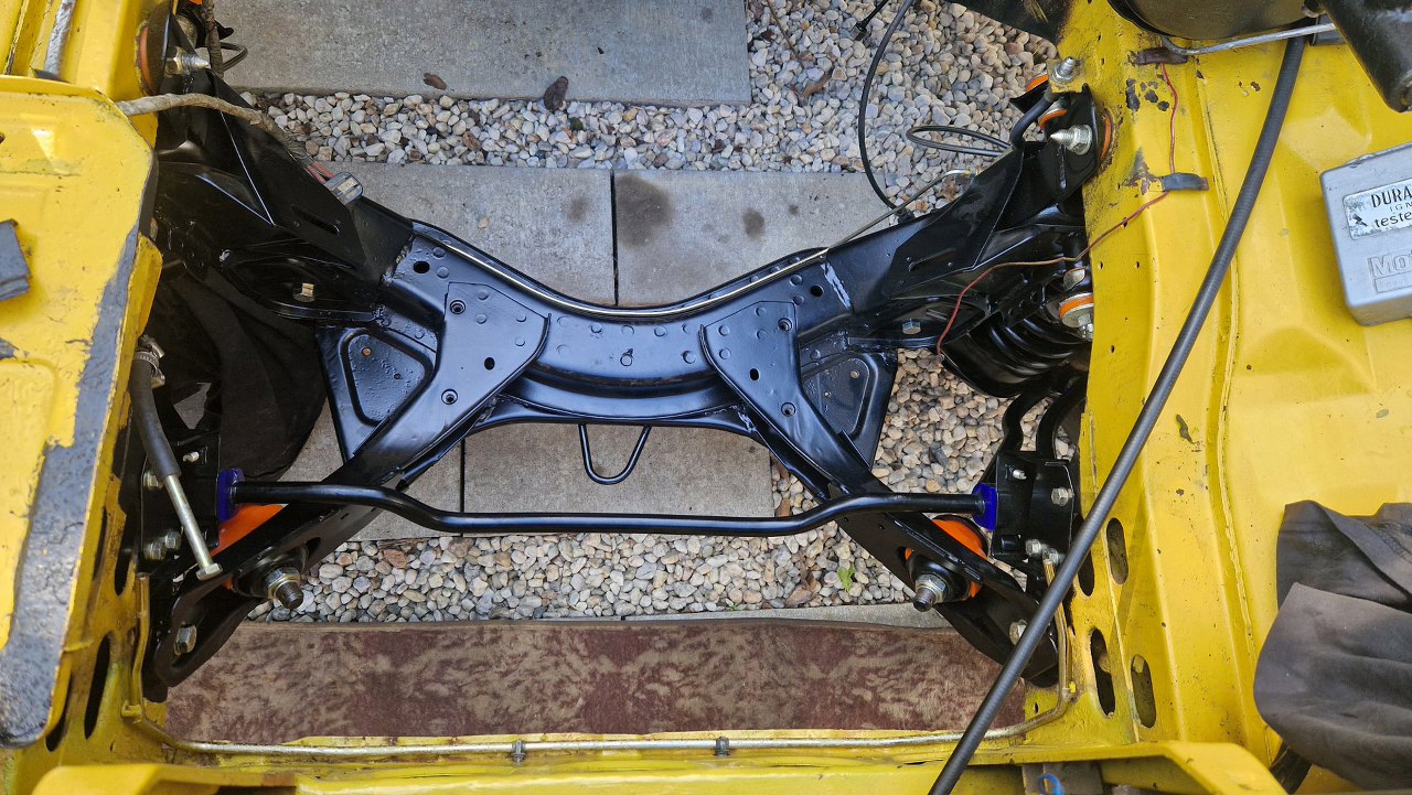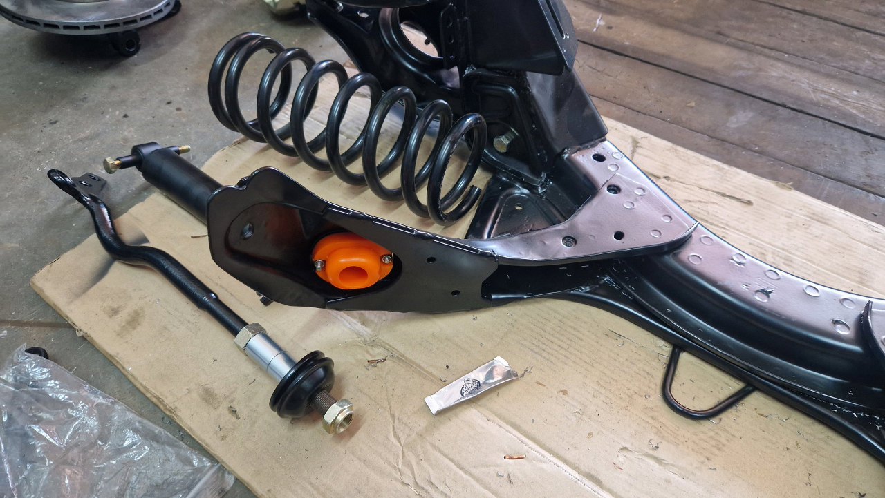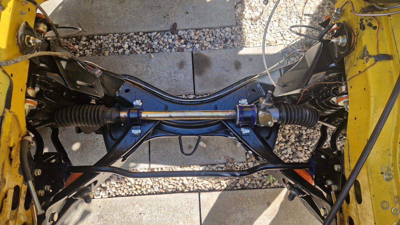 Założyłem wahacze na belkę i przykręciłem. Plus poliuretanów jest taki, że nie trzeba czekać z dokręcaniem śrub na postawienie samochodu na koła z silnikiem itd. - poliuretany pracują jak łożyska, a nie jak gumy, na skręcanie.