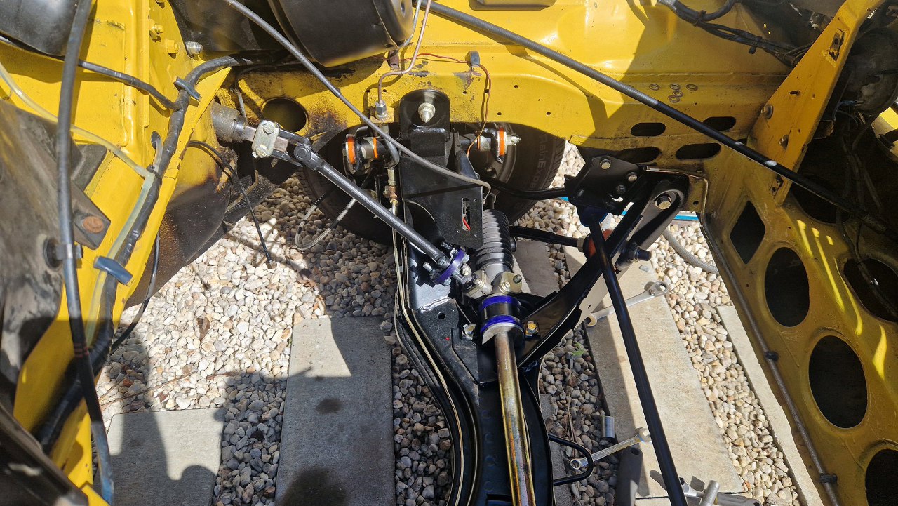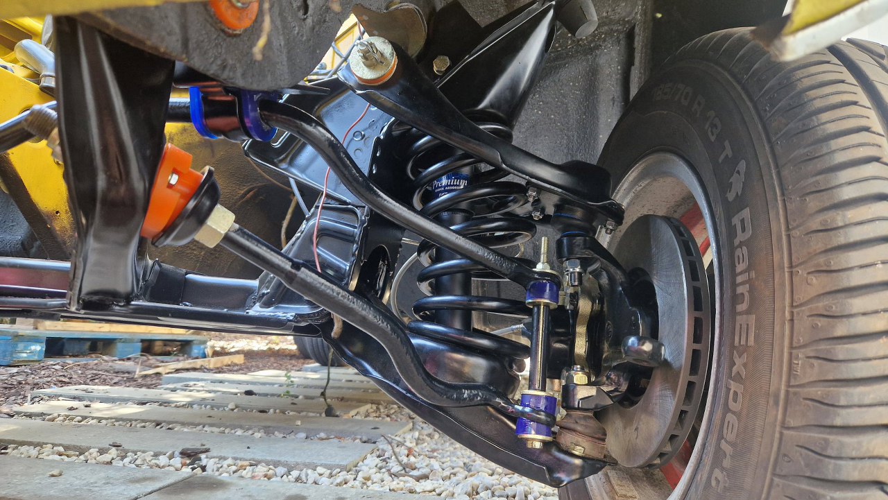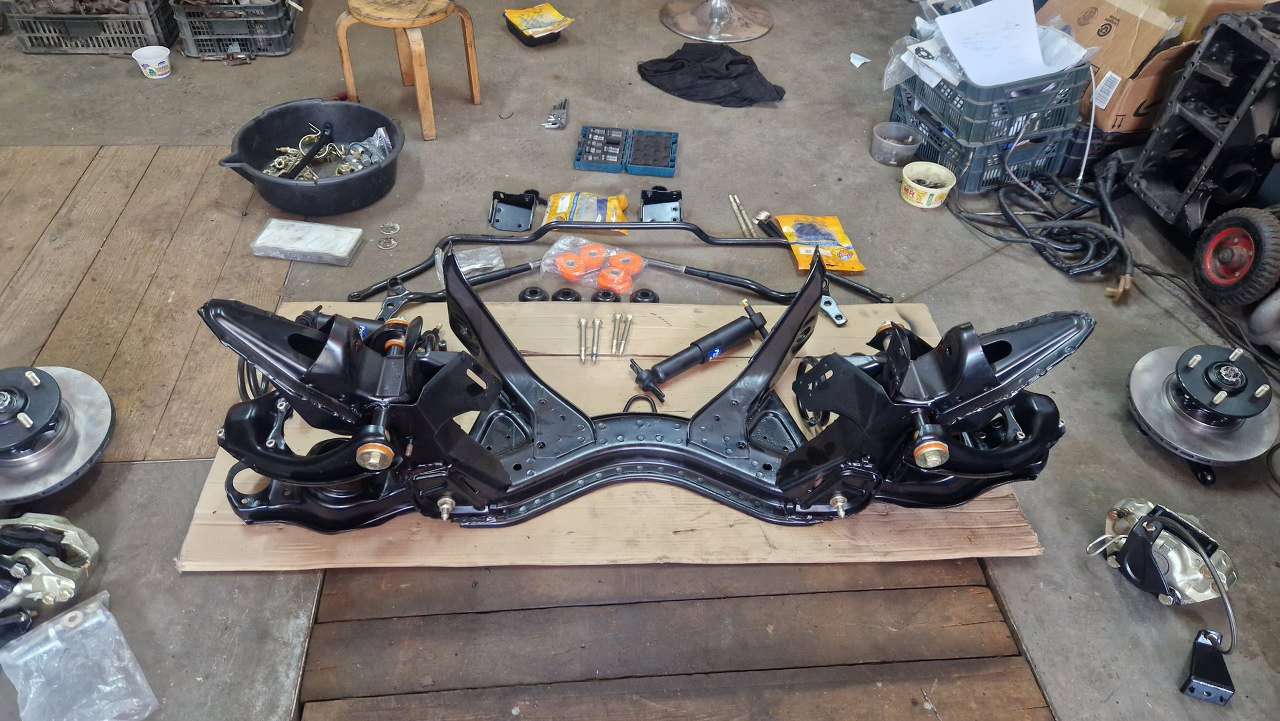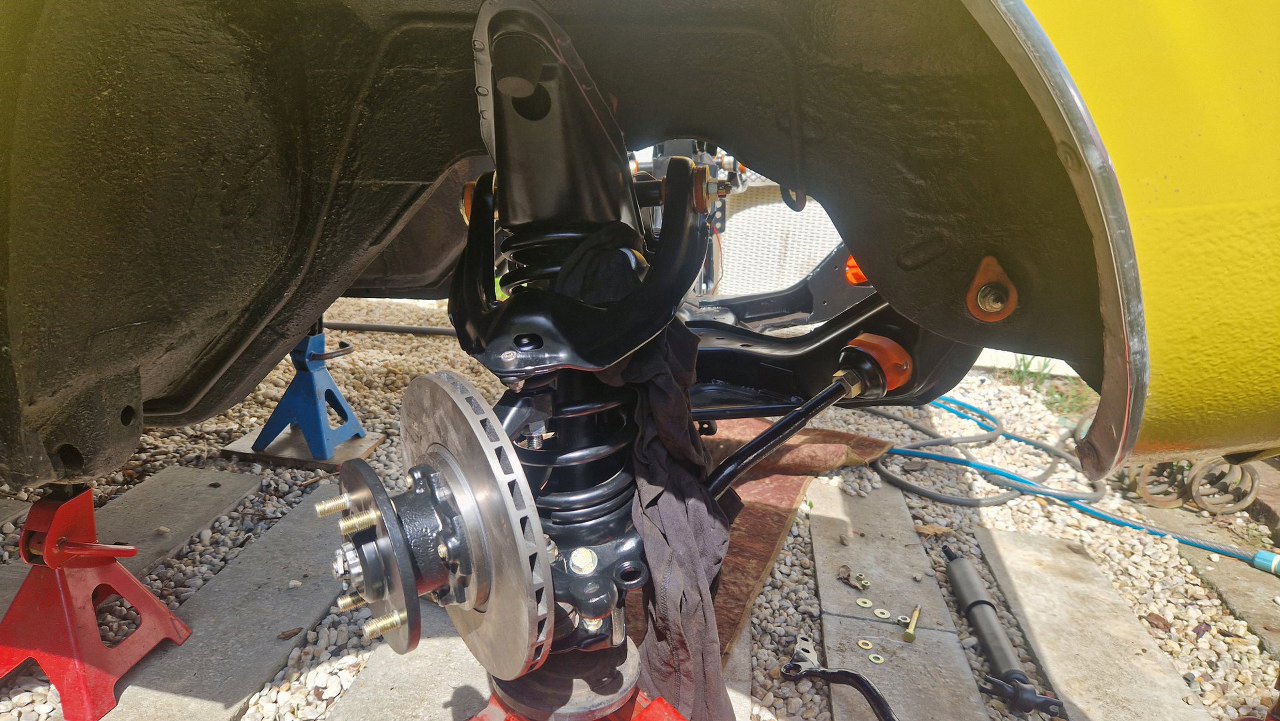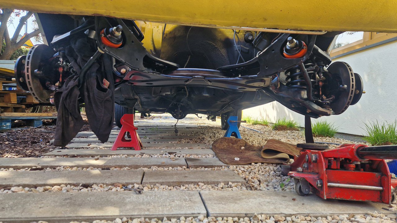 Założyłem wahacze na belkę i przykręciłem. Plus poliuretanów jest taki, że nie trzeba czekać z dokręcaniem śrub na postawienie samochodu na koła z silnikiem itd. - poliuretany pracują jak łożyska, a nie jak gumy, na skręcanie.