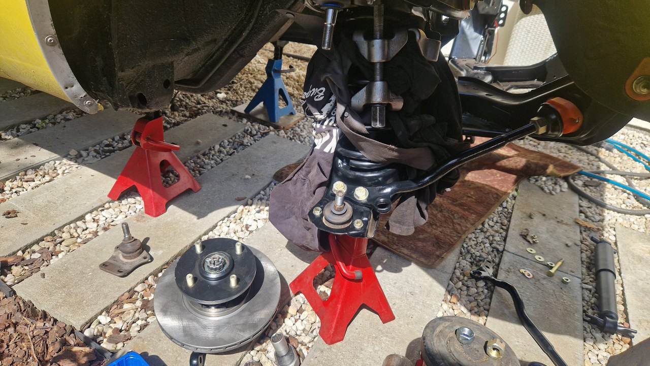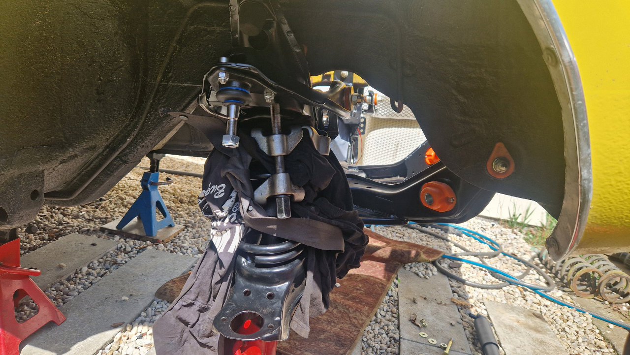 Minusem zakładania sprężyn bez silnika jest to, że całe ściśnięcie musi się odbyć za pomocą ściągaczy. Z silnikiem można się trochę bardziej wspomóc masą samochodu. W każdym razie ścisnąłem sprężynę do momentu, aż mogłem założyć amortyzator.