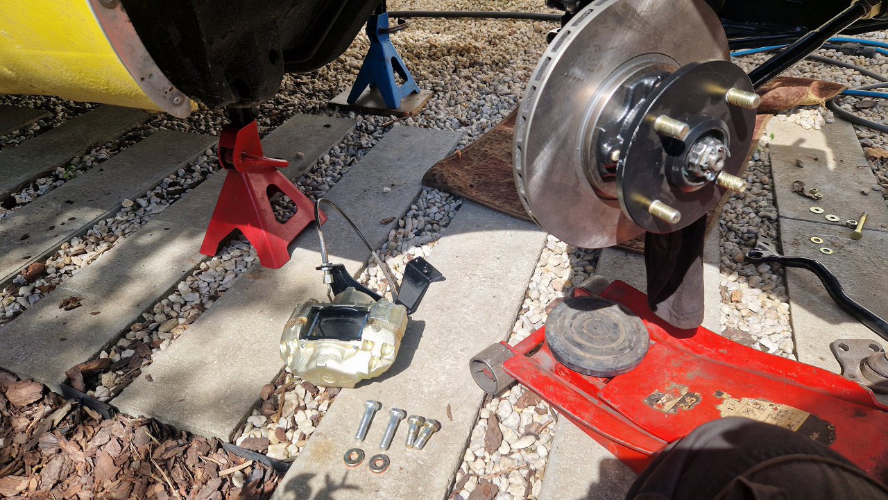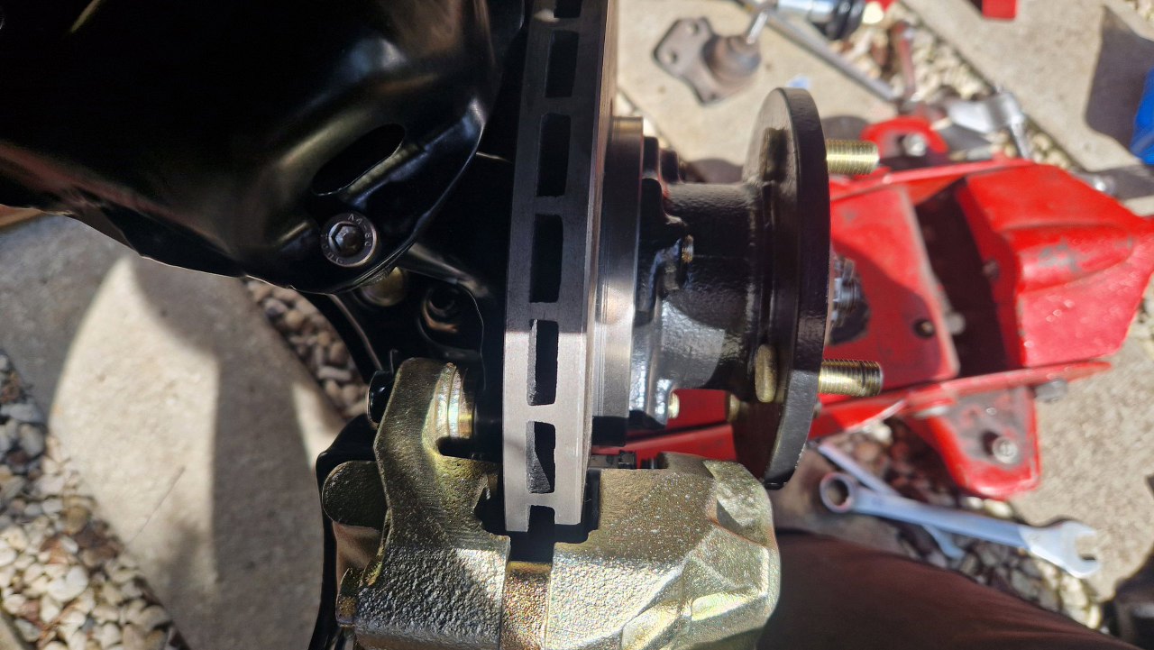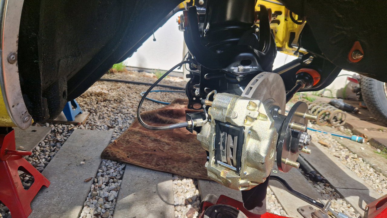 Zacisk jednak jest już przykręcony. Przykręciłem też mocowanie drugiego końca przewodu hamulcowego do belki zawieszenia.