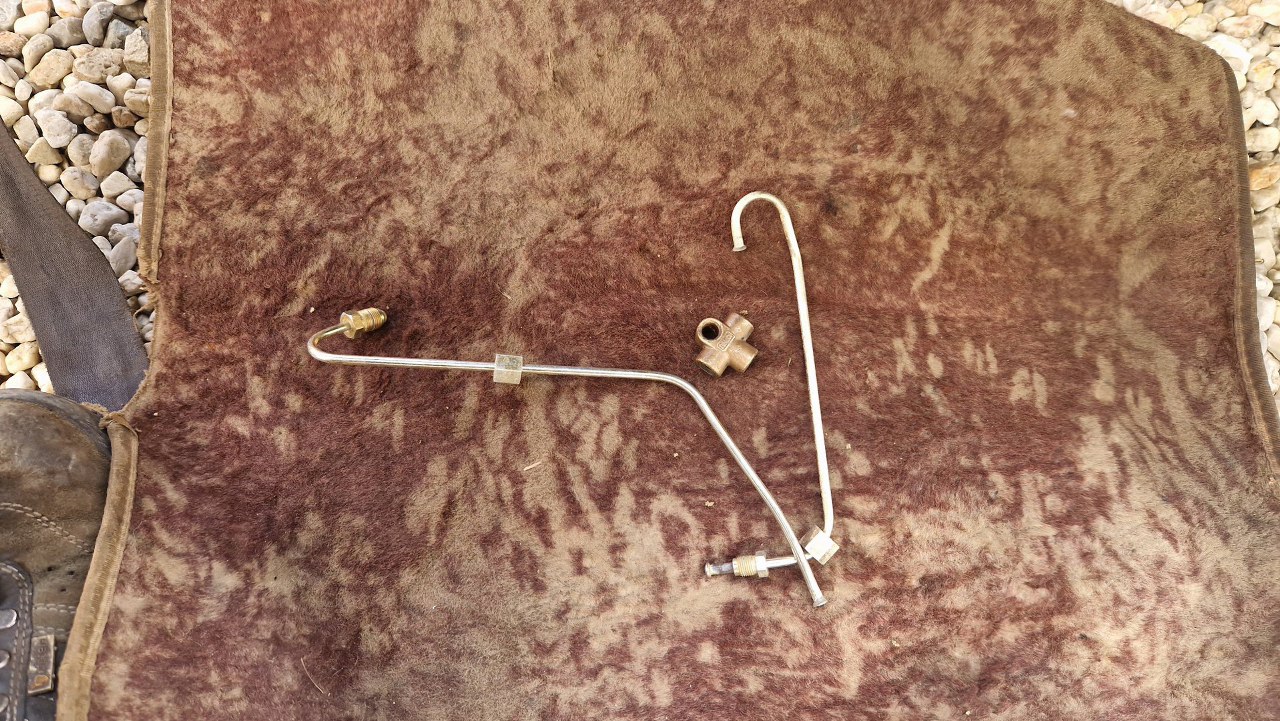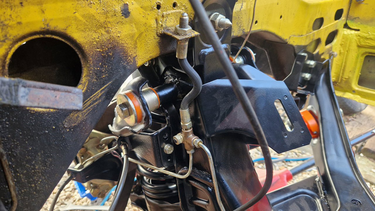 Zamontowałem też rurki hamulcowe, tu są rurki lewej strony zawieszenia. Jedna z nich łączy zacisk z trójnikiem, a druga - trójnik z pompą hamulcową.