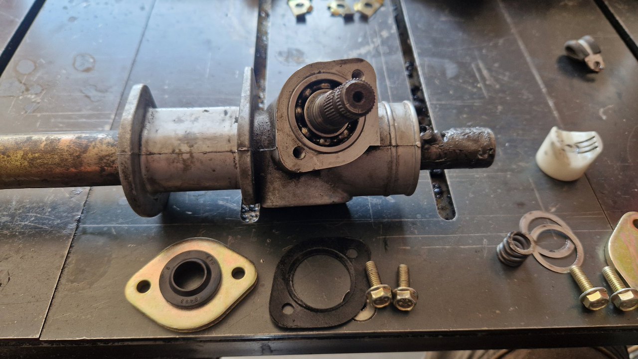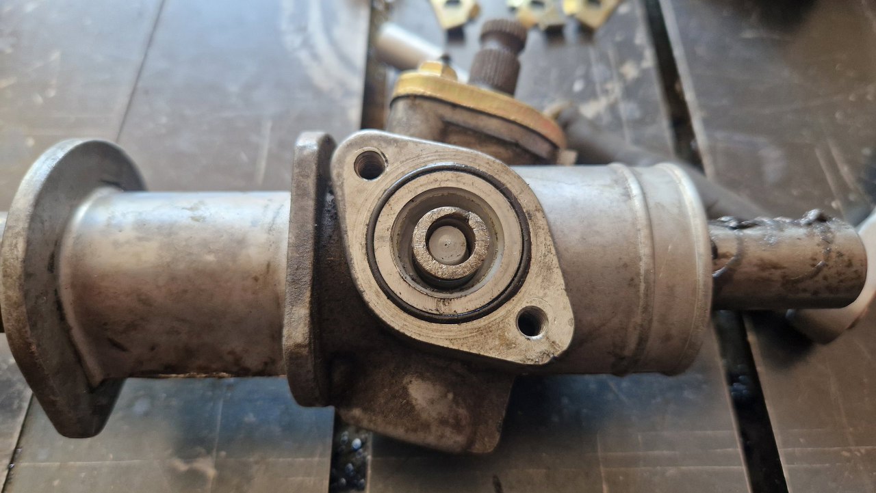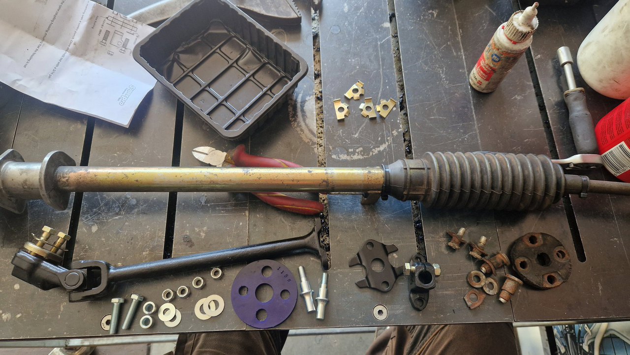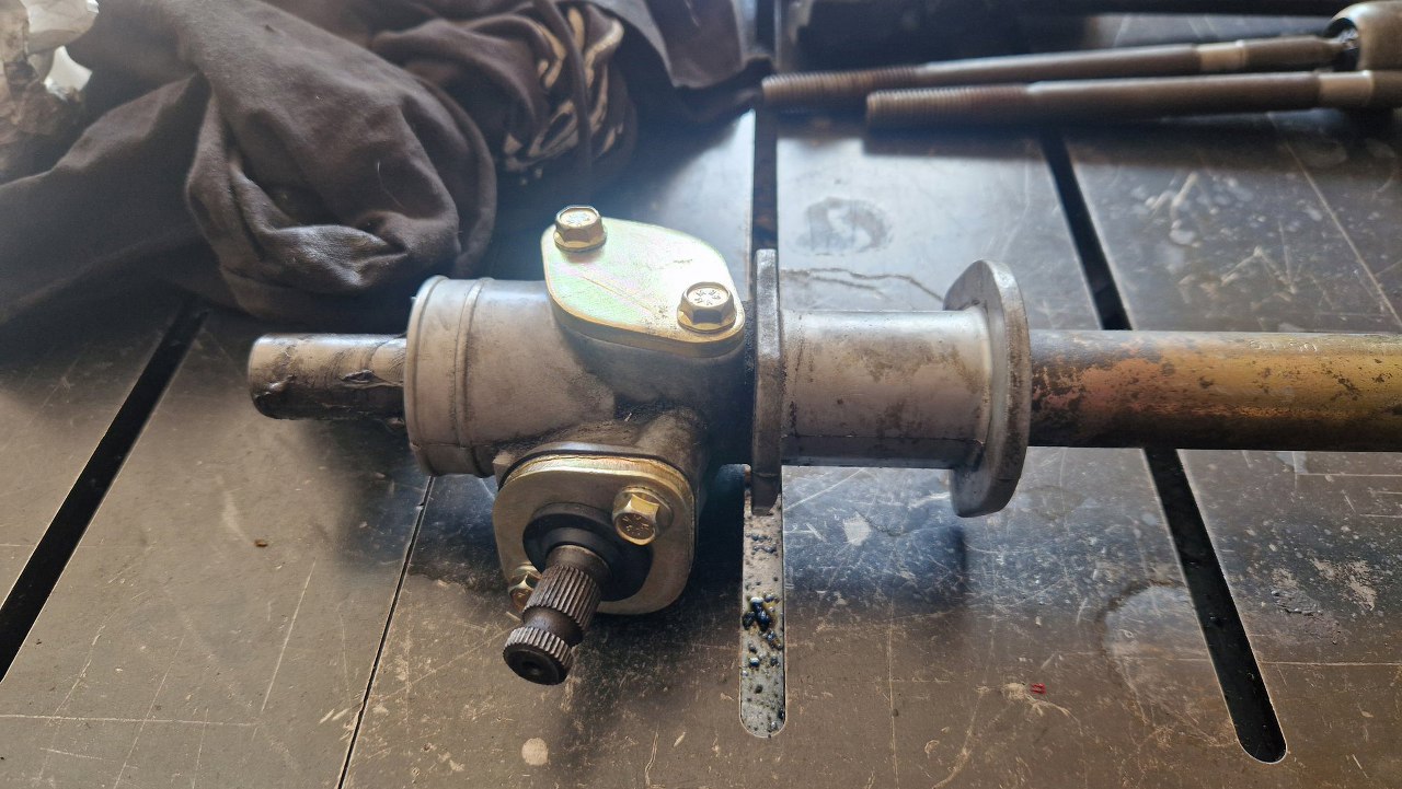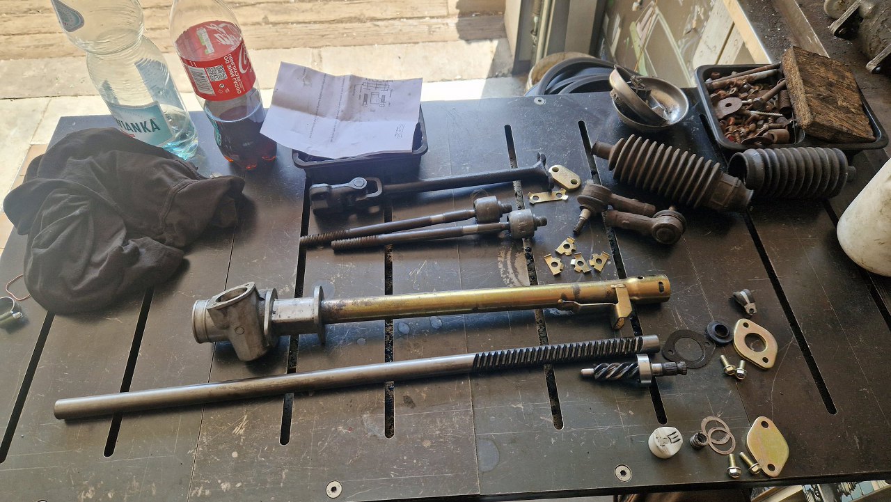 Oczywiście brakuje tam przekładni kierowniczej. Ponieważ ta jest w dobrym stanie, to tylko ją wyczyszczę, nasmaruję świeżym smarem i poskładam.