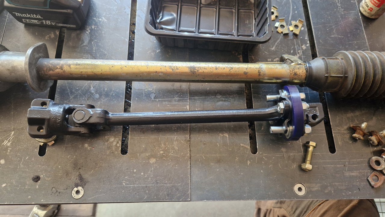 Potem przykręciłem drążki kierownicze i założyłęm osłony. Pora na złożenie łącznika kolumny kierownicy z przekładnią. Stara guma łącząca była już zużyta, więc i tu zakładam nowy poliuretan.
