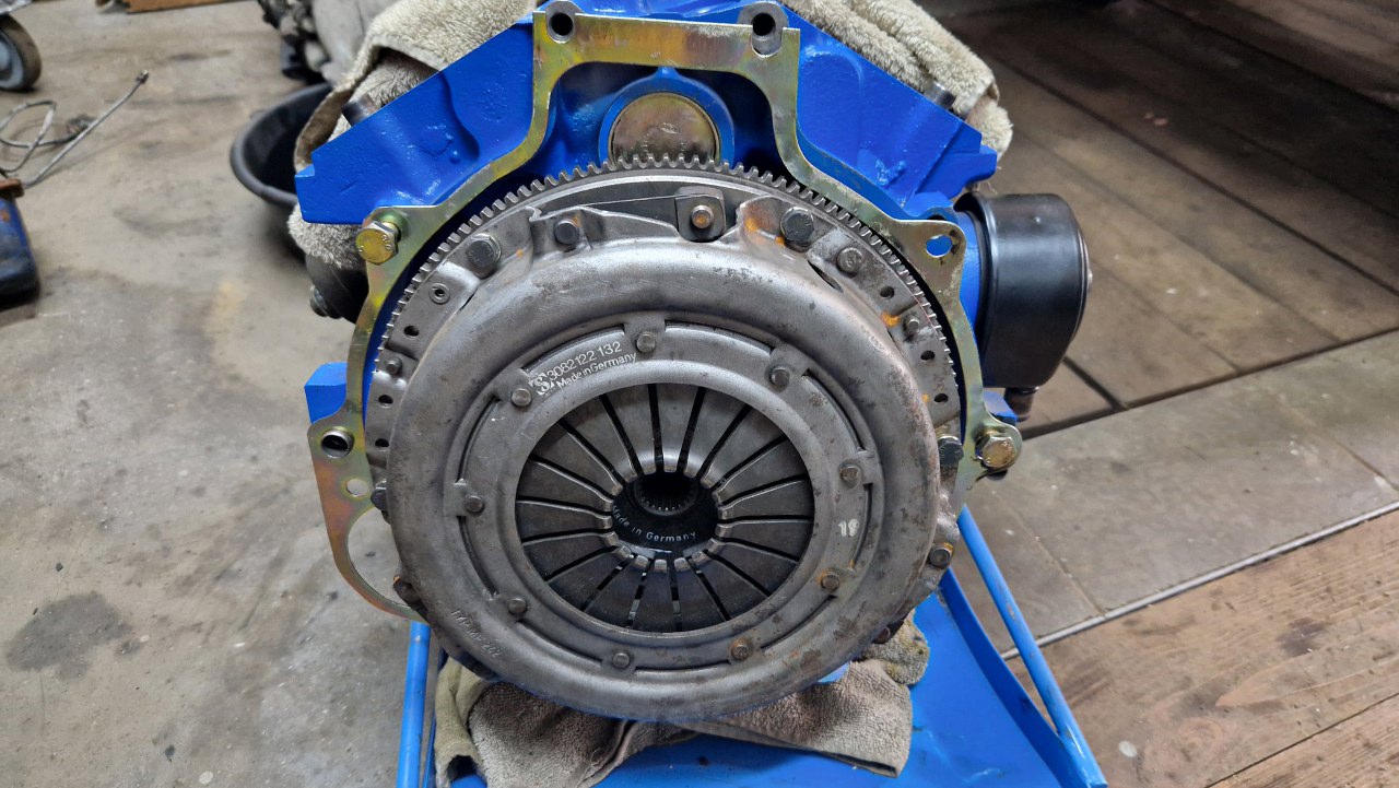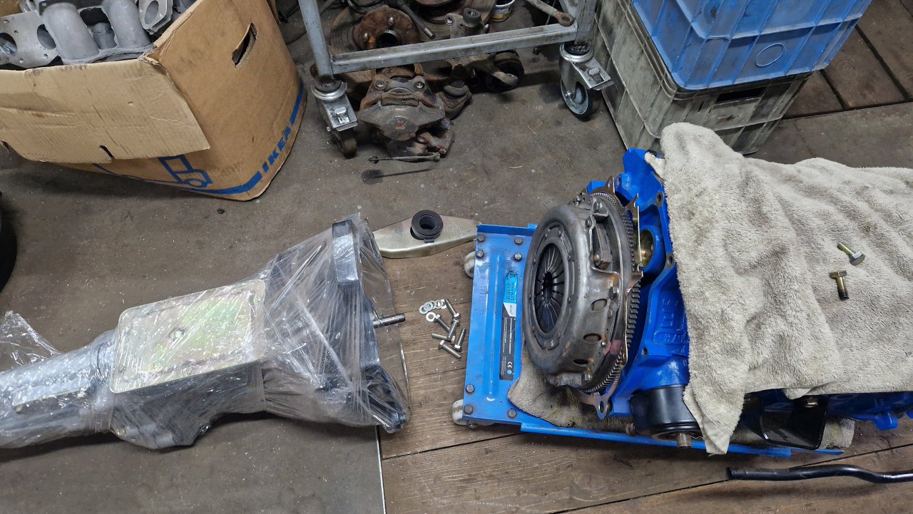 Mając już samochód na kołach, mogłem się zabrać do połączenia silnika ze skrzynią. Przygotowałem łapę sprzęgła i śruby łączące obie te części.