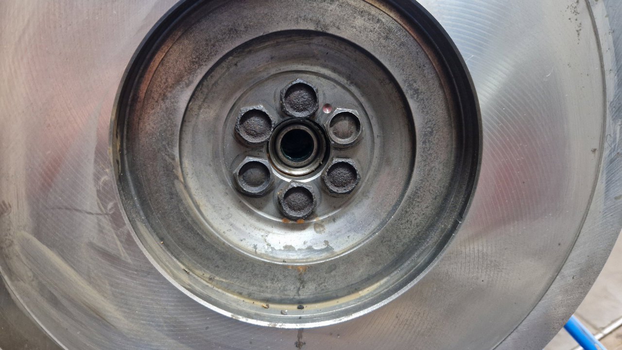 Po kilku próbach trafienia skrzynią na silnik w końcu się poddałem. Nie pasuje i koniec. Zdjąłem sprzęgło i sprawdziłem jeszcze raz łożysko pilotujące sprzęgło (mimo, że już wcześniej to sprawdzałem) i okazało się, że jest na wałek sprzęgłowy o mniejszej średnicy... nic dziwnego, że skrzynia nie chciała wejść na miejsce. Łożysko wyjąłem za pomocą sztuczki z mokrym ręcznikiem papierowym.