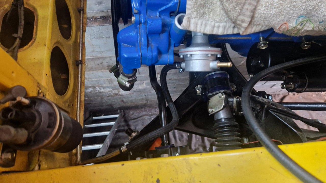Ponieważ totalnie to nie pasowało, silnik na razie zostawiłem leżący na deseczce, przykręciłem tylko łapę skrzyni, tą starą, wyspawaną z profila. Później się tym zajmę, póki co załatwiliśmy nowe, tym razem już właściwe, łapy. A ja zająłem się drobiazgami - podłączyłem rurkę paliwową spod chłodnicy do rurki idącej od zbiornika paliwa.