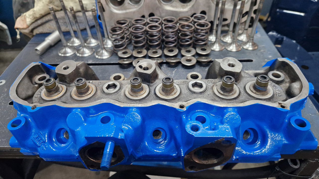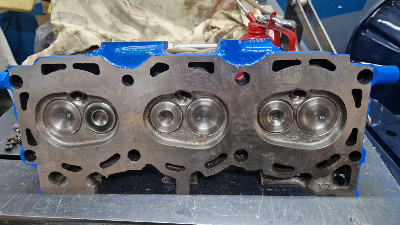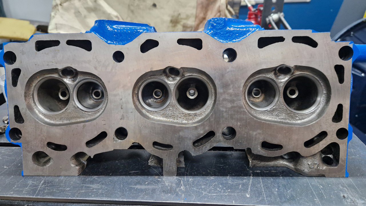 Potem pomierzyłem komory spalania i na podstawie ich pojemności wyliczyłem, ile trzeba splanować głowice, żeby uzyskać stopień sprężania, który sobie wymyśliłem (w sumie dość wysoki). Oprócz planowania głowice zostały w szlifierni standardowo przejrzane, wstawione zostały nowe prowadnice zaworowe, szlifowane były zawory i gniazda. Przynajmniej nie trzeba było tu wstawiać twardych gniazd zaworowych, bo są to rzadkie głowice od Scorpio 2.8, które już fabrycznie takie gniazda miało. Po powrocie głowic ze szlifierni zostały one porządnie umyte, oczyszczone z korozji i resztek starej farby i pomalowane.