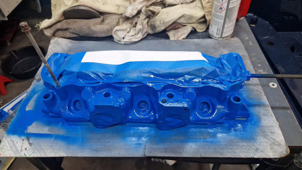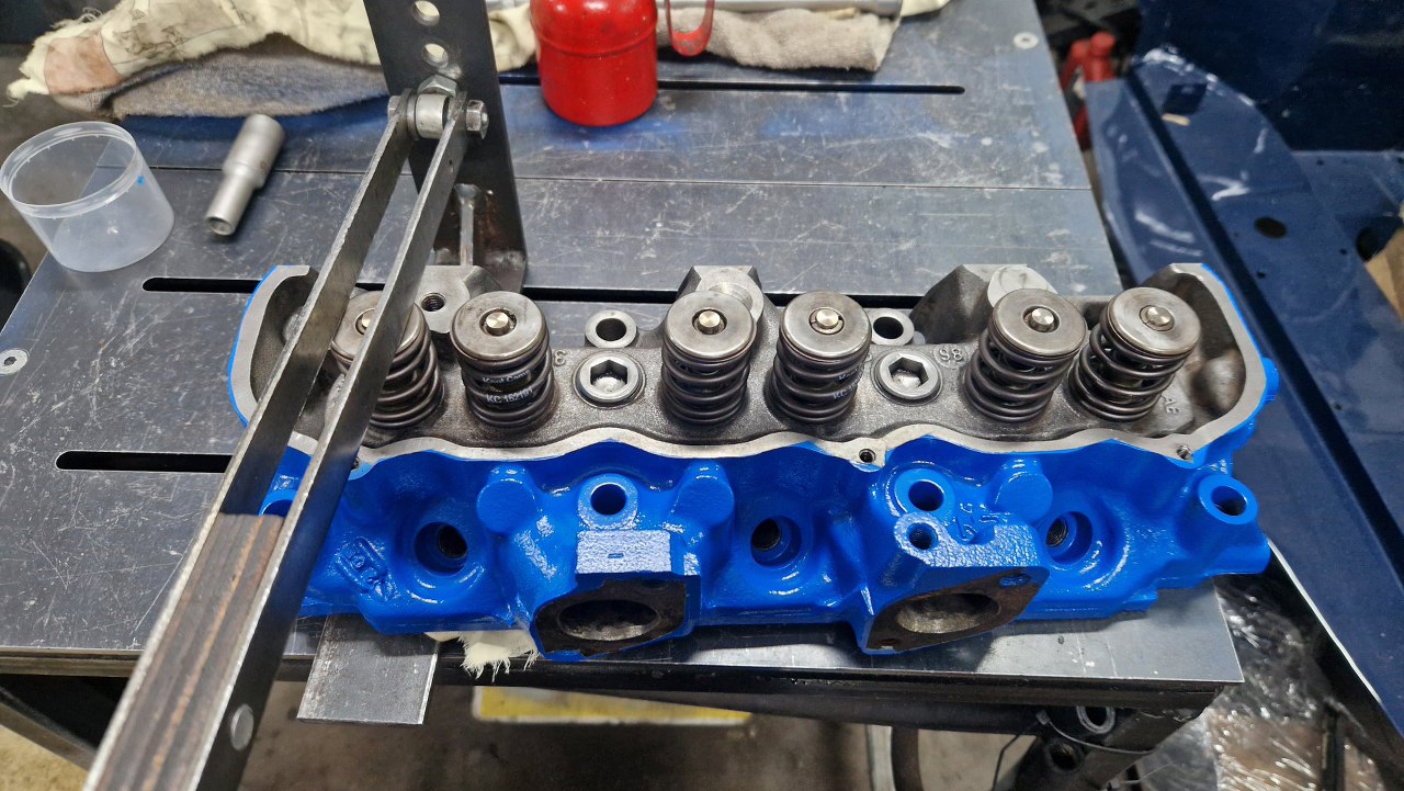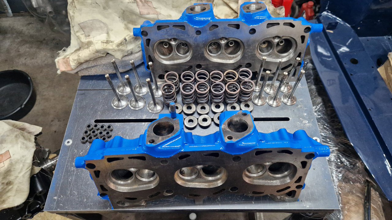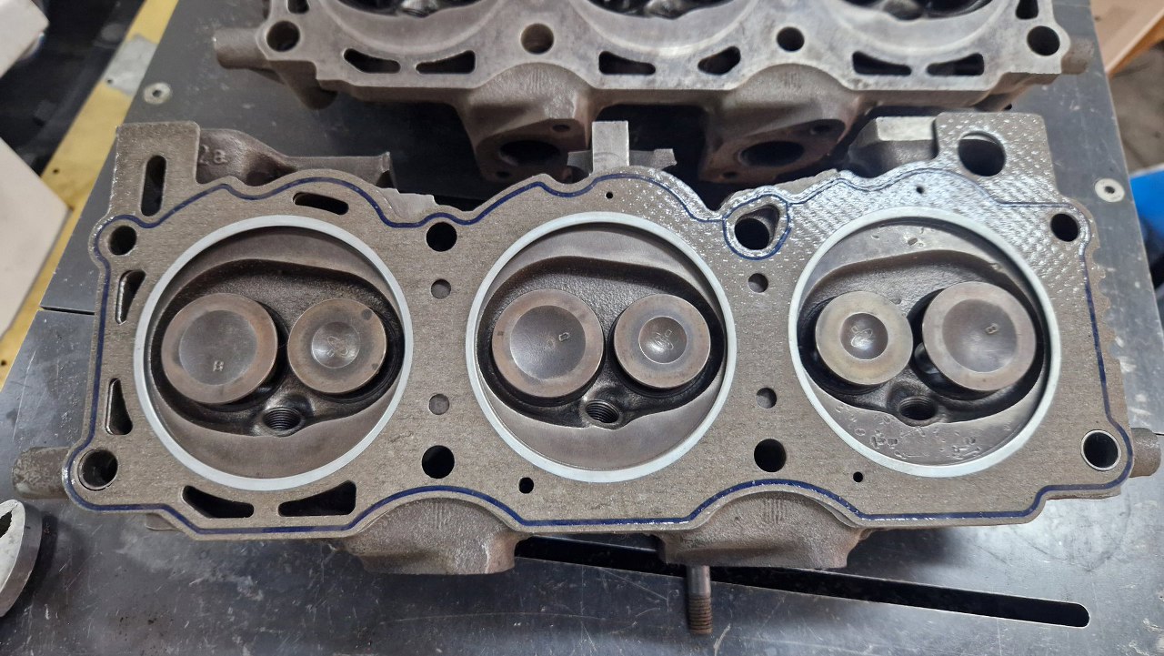 Potem pomierzyłem komory spalania i na podstawie ich pojemności wyliczyłem, ile trzeba splanować głowice, żeby uzyskać stopień sprężania, który sobie wymyśliłem (w sumie dość wysoki). Oprócz planowania głowice zostały w szlifierni standardowo przejrzane, wstawione zostały nowe prowadnice zaworowe, szlifowane były zawory i gniazda. Przynajmniej nie trzeba było tu wstawiać twardych gniazd zaworowych, bo są to rzadkie głowice od Scorpio 2.8, które już fabrycznie takie gniazda miało. Po powrocie głowic ze szlifierni zostały one porządnie umyte, oczyszczone z korozji i resztek starej farby i pomalowane.