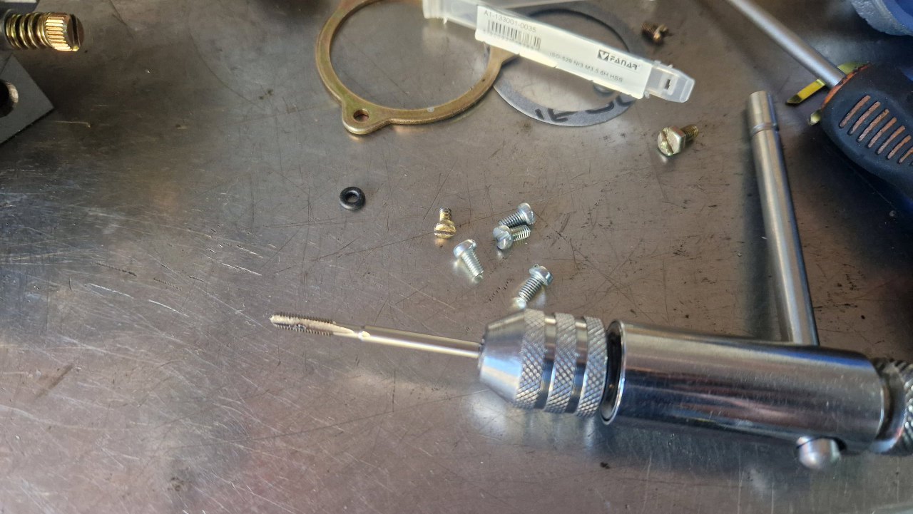 W ośce klapek ssania były już niepewne gwinty M3, więc kupiłem śrubki i gwintownik M3.5, żeby zadbać o pewne mocowanie.