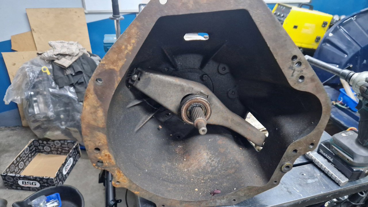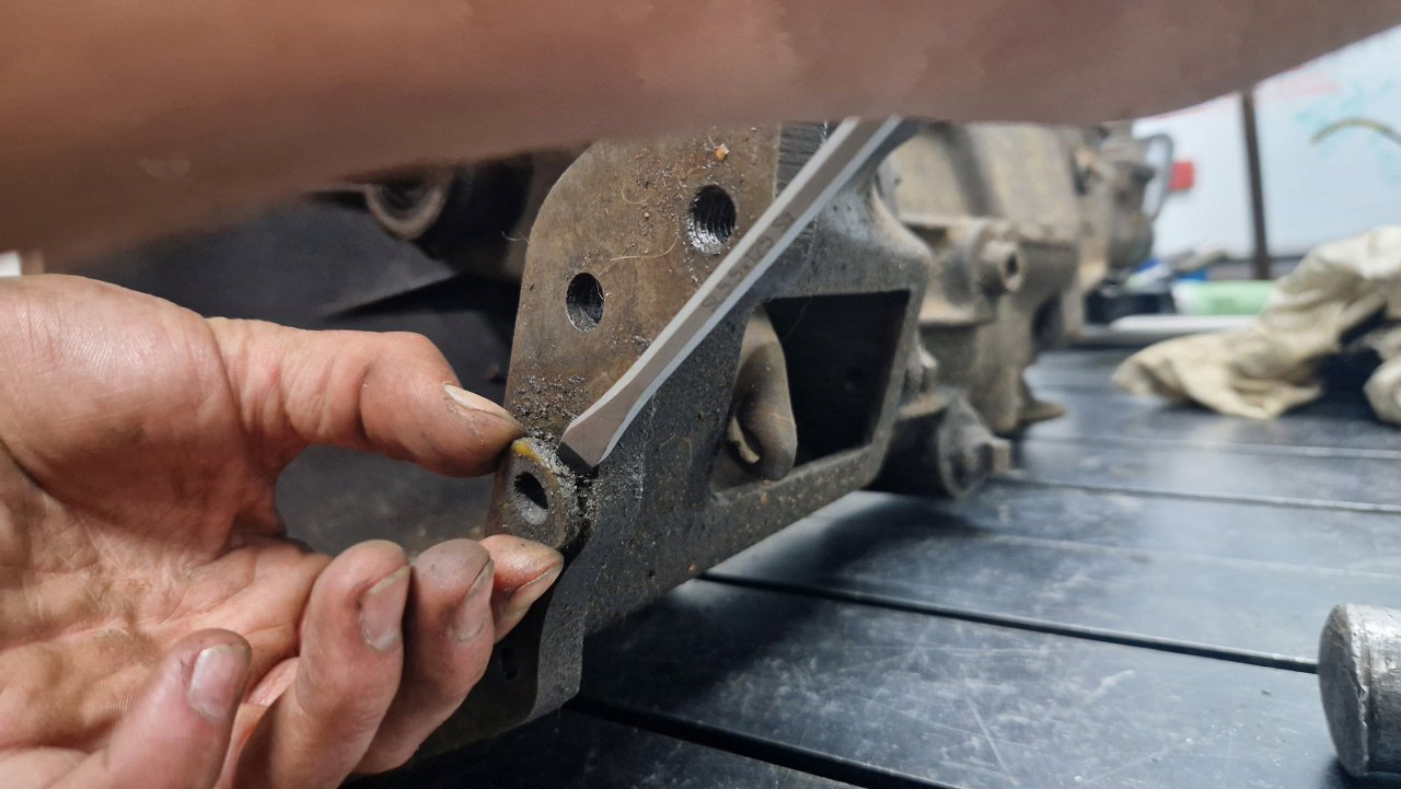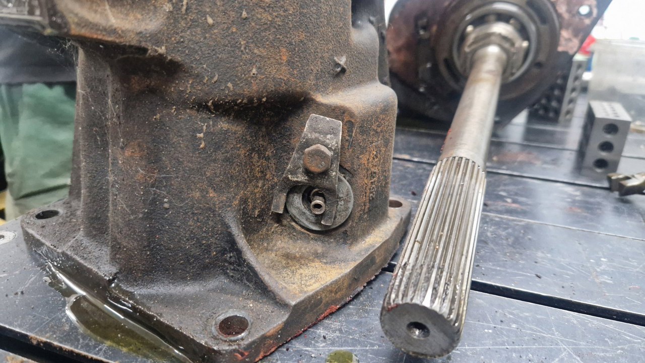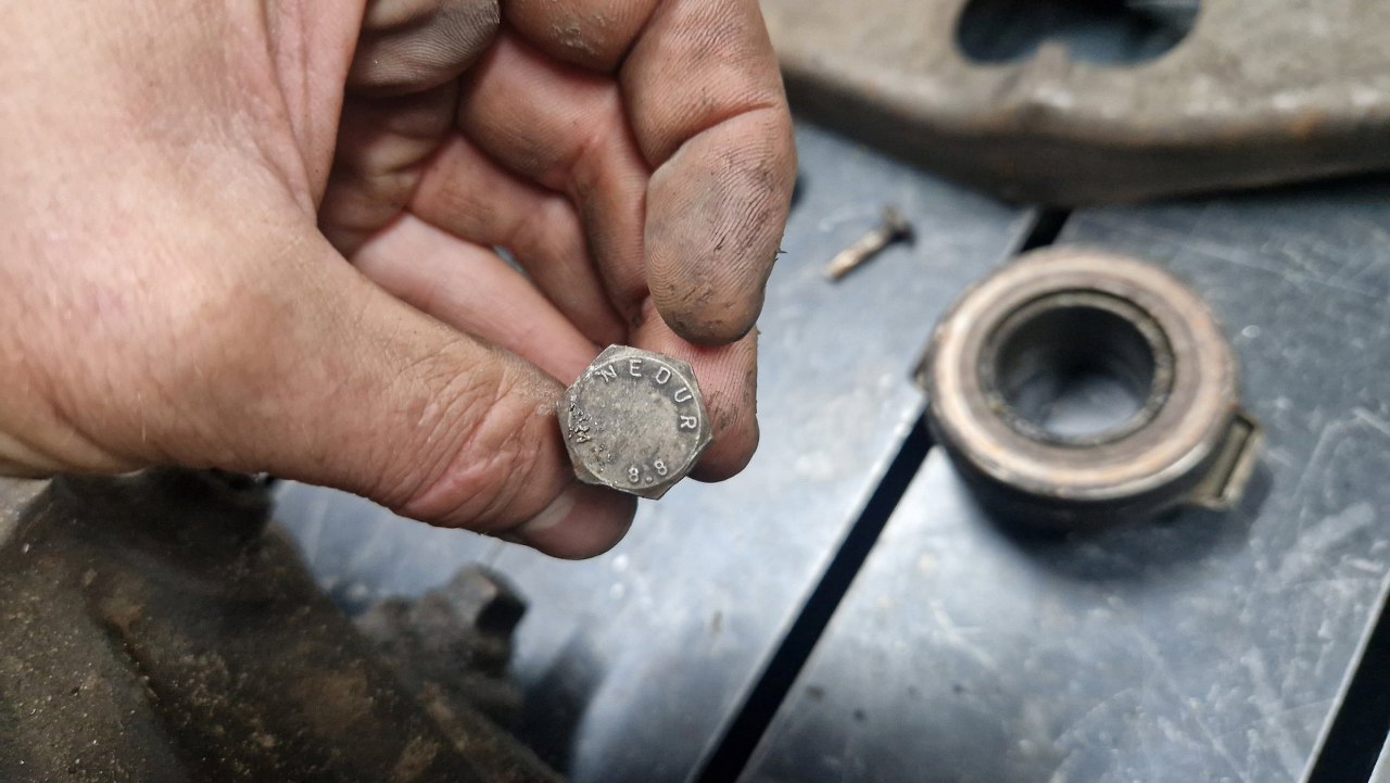 No i już tutaj mamy pewne niespodzianki. Wszystkie śruby mocujące dzwon są wkręcone tylko kawałek, ale mimo to nie chcą wkręcać się dalej... czemu? Otóż skrzynia ma wszystko calowe, a śruby ktoś wkręcił metryczne. Już wiem, że będzie wesoło. Zwróć też uwagę na ten dzyndzel wystający po prawej z dzwonu - to jest kołek trzymający łapę sprzęgła, ale z jakiegoś powodu jest dłuższy i zagięty młotkiem, żeby się nie wysunął.