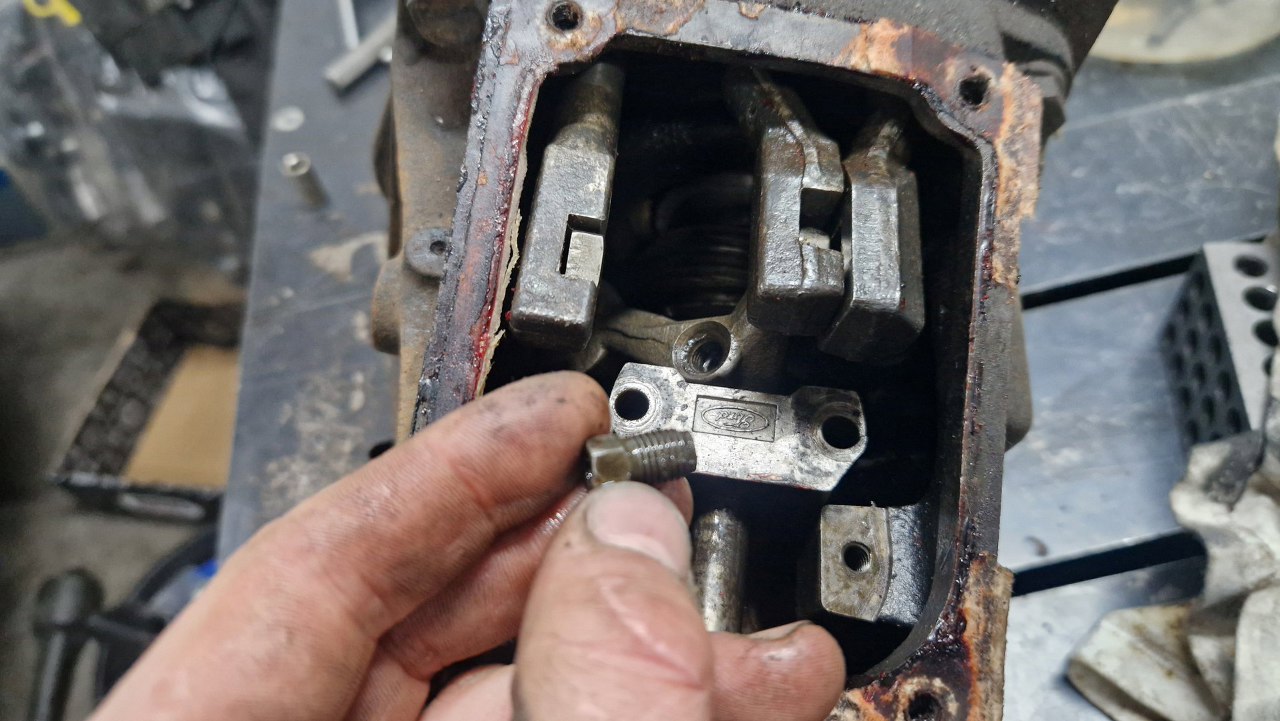 Spróbowałem odkręcić śrubę łączącą pręt idący od dźwigni zmiany biegów z elementem przekazującym ruch na jeden z trzech wybieraków. Śruba jest wydrążona, przez co dość delikatna. No i niestety się urwała.