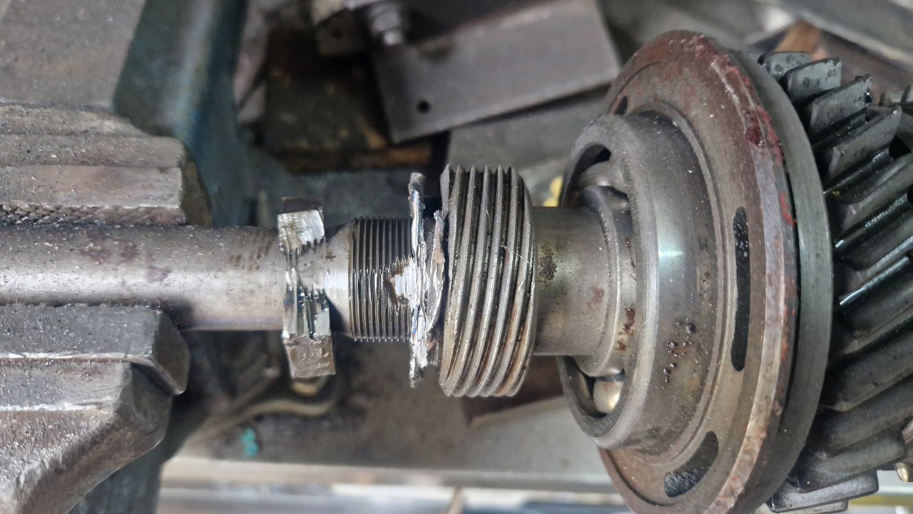 Podkładka, którą się zagina na nakrętkę, żeby zabezpieczyć ją przed odkręceniem, była zagięta na wszystkie sześć płaszczyzn nakrętki, i to zagięta przecinakiem, więc nie dało się tego normalnie odgiąć. Wałek i tak jest złomem, więc po prostu odciąłem nakrętkę.