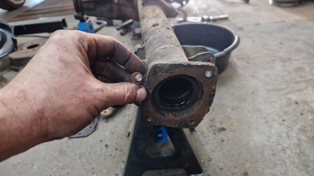 Są nawet śruby trzymające wał napędowy. Wały napędowe zresztą też dostałem ale są dwa różne, żaden nie jest dobry, są też nieco przerobione, więc bez samochodu do przymiarek ciężko jest z tego coś dobrego wykrzesać. Na razie wał zostawiamy.