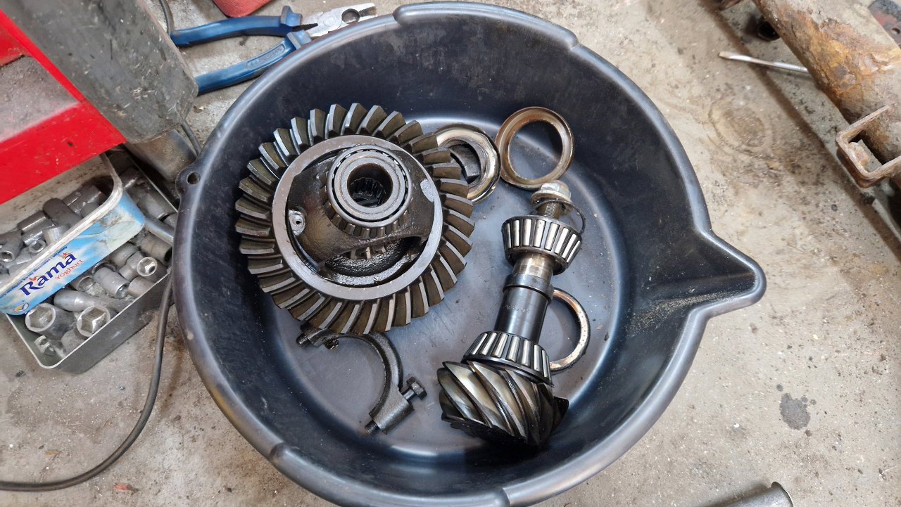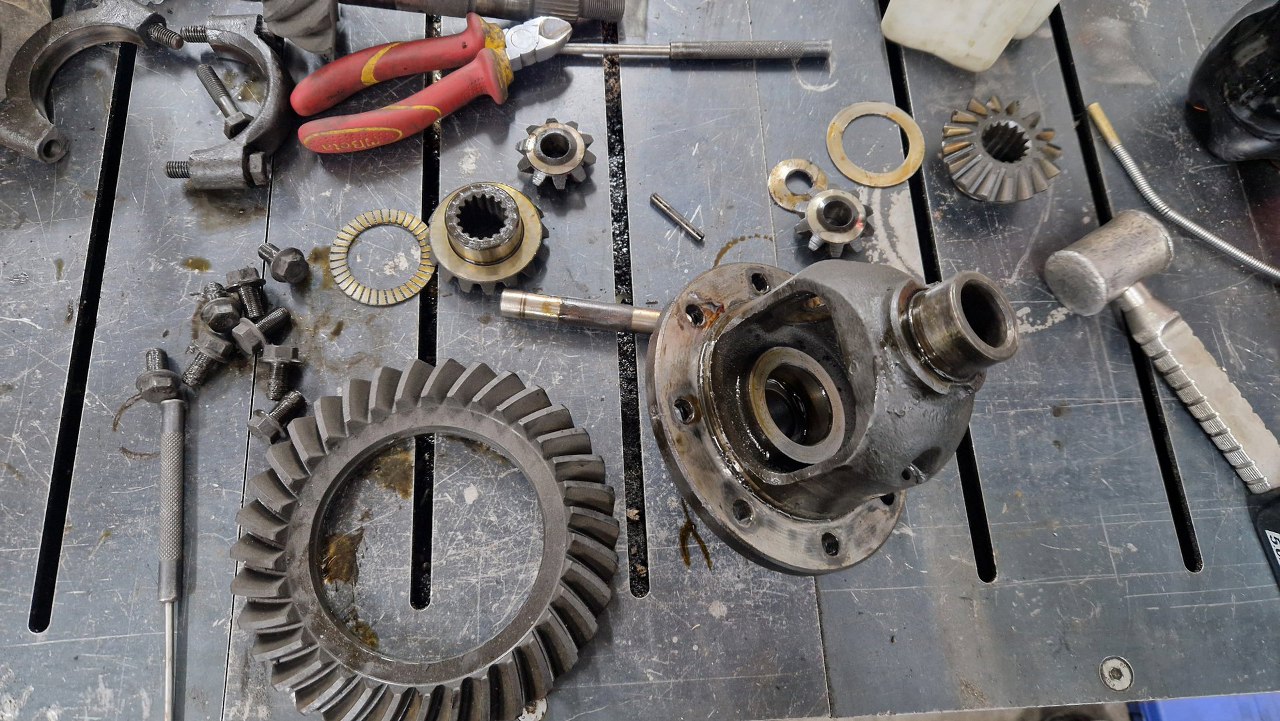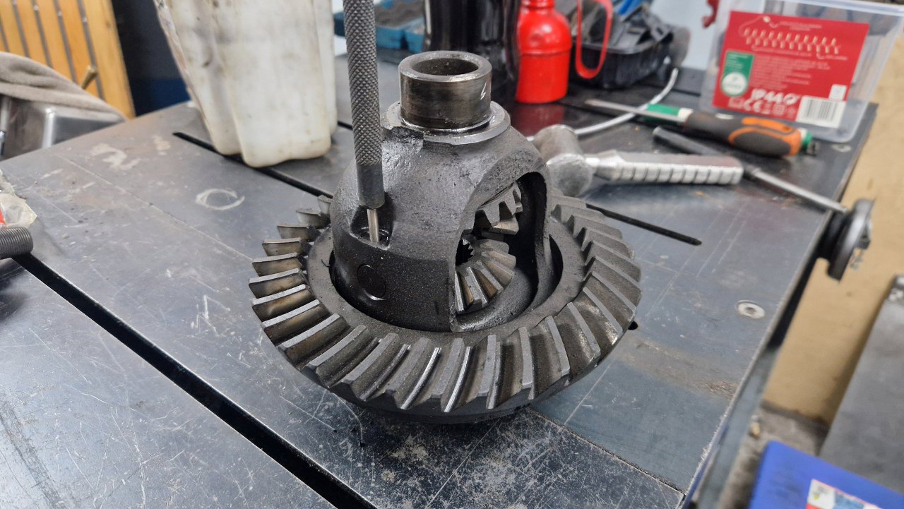 Rozłożę mechanizm różnicowy, żeby sprawdzić jego stan. Wybiłem pin blokujący ośkę satelit w obudowie.
