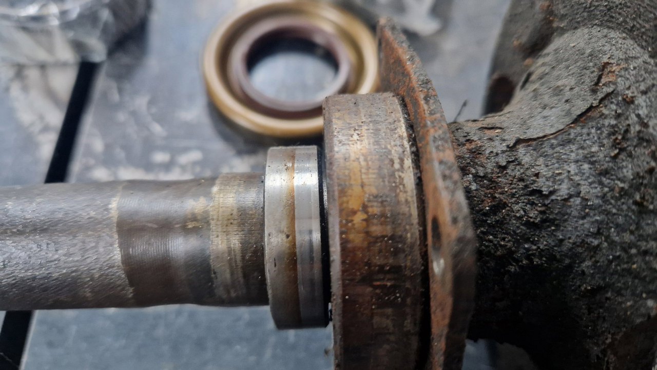 Na jednej półosi ktoś założył nowe (kiedyś nowe oczywiście) łożysko, pierścień zabezpieczający i resztkę starego łożyska. Podejrzewam, że miał tylko nowe łożysko, a pierścień był użyty ponownie stary, dlatego dla pewności było założone to, co zostało ze starego łożyska. Ten pierścień zabezpiecza przed wysunięciem się półosi z łożyska i, co za tym idzie, z mostu.