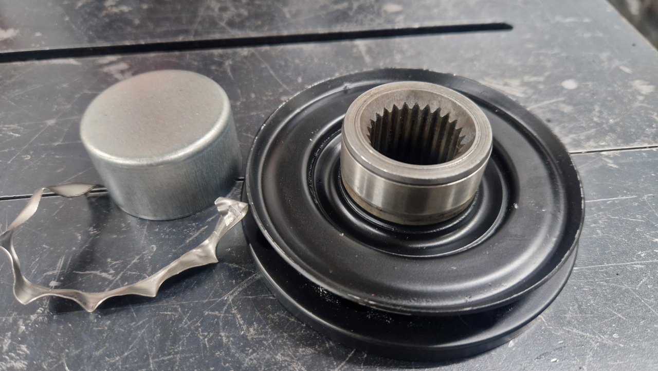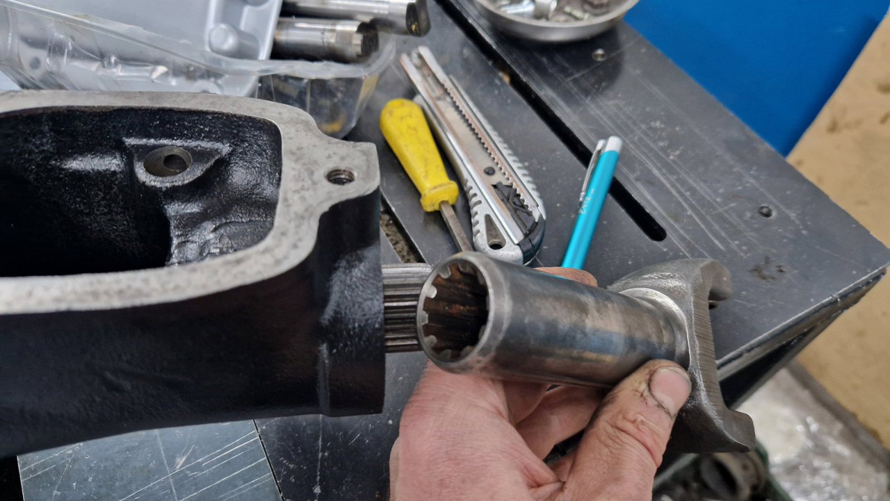 A pasująca do skrzyni końcówka jest dość mocno zgnita i by ciekła. Do tego oba wały różnią się długościami segmentów, więc nie mając auta pod ręką do pomiarów nie bardzo jest jak to poprawnie złożyć... Temat wału na razie więc odpuszczamy.