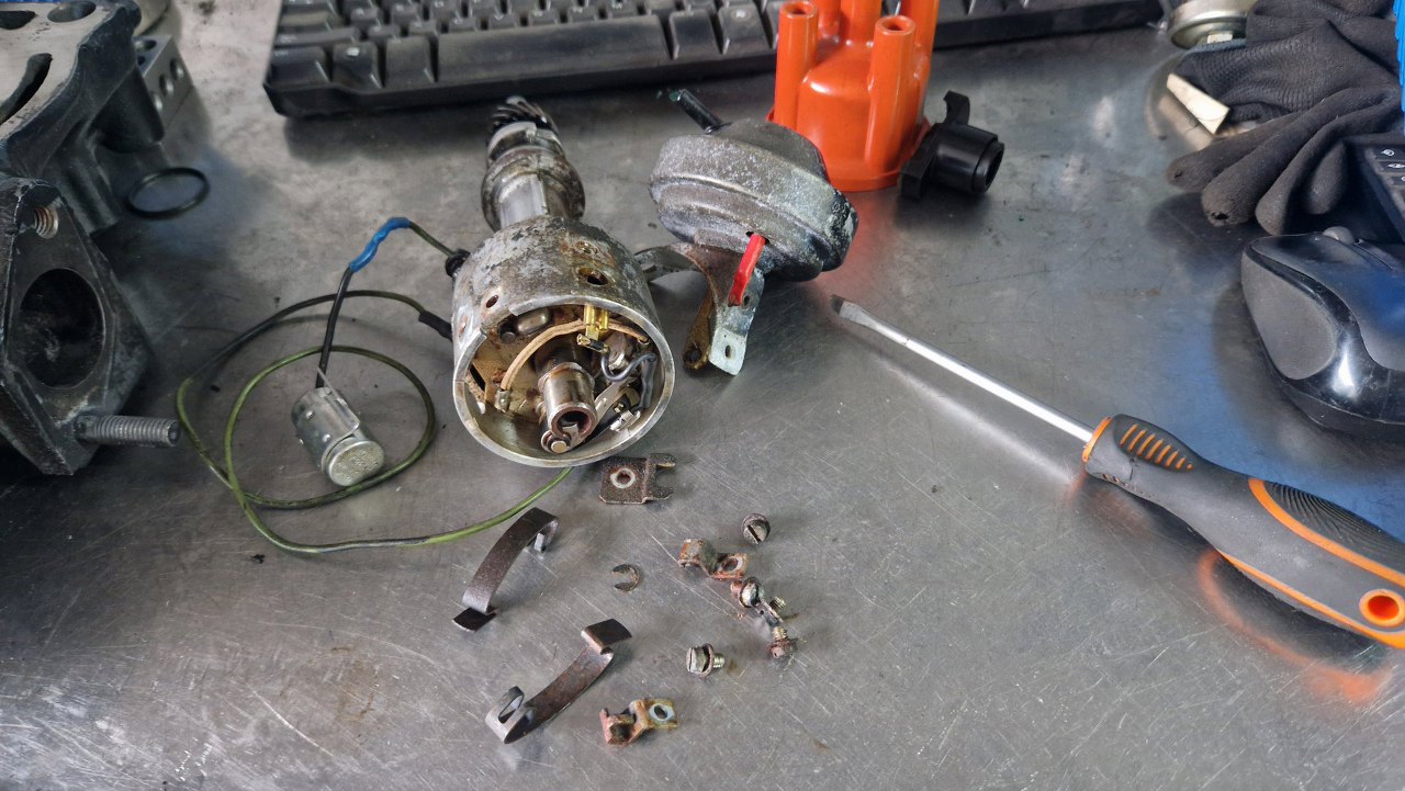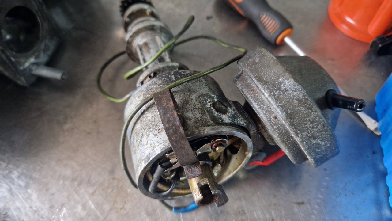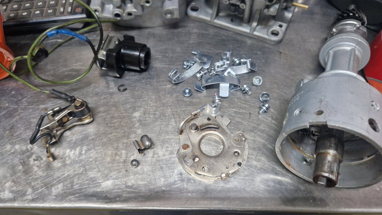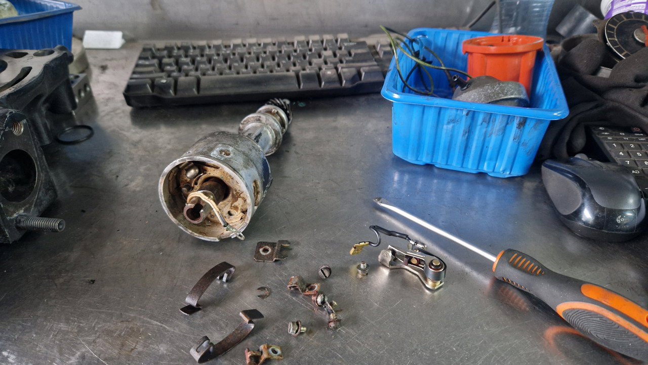 Zacząłem to wszystko rozkręcać. Kondensator nie jest oryginalny, bo oryginalny ma zintegrowany kabelek łączący go z przerywaczem i cewką - ale tu wszystko jest sprawne, więc może zostać.