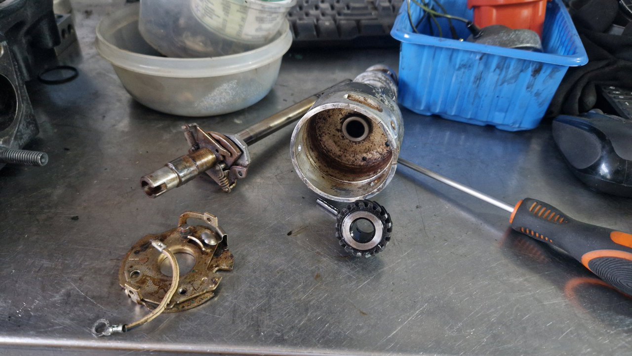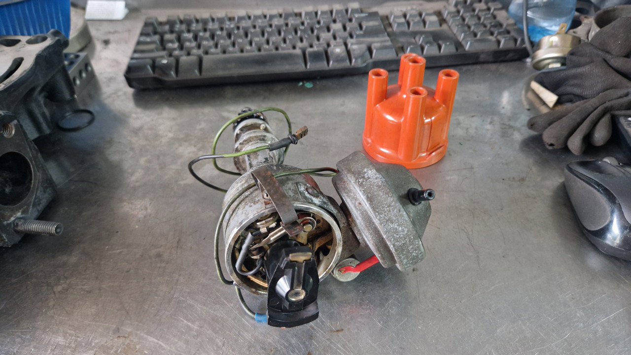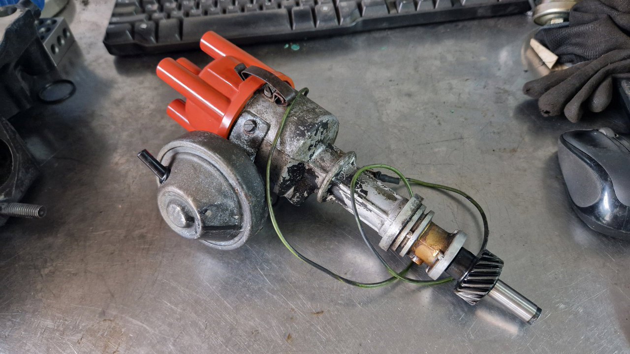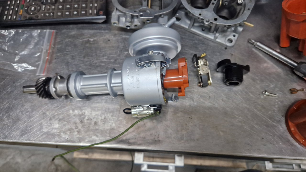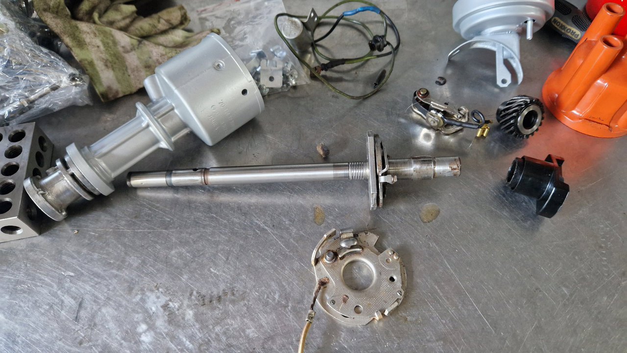 Zacząłem to wszystko rozkręcać. Kondensator nie jest oryginalny, bo oryginalny ma zintegrowany kabelek łączący go z przerywaczem i cewką - ale tu wszystko jest sprawne, więc może zostać.