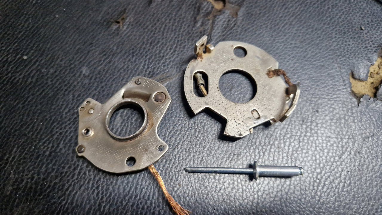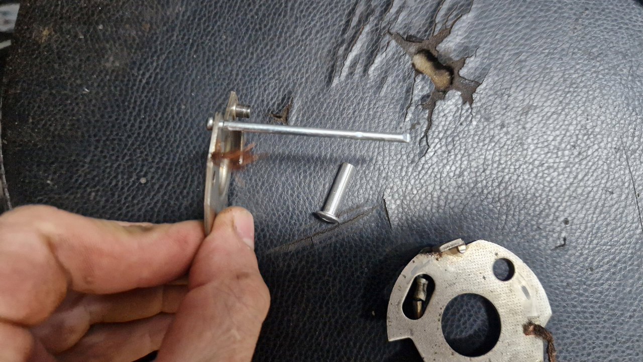 Okazało się, że płytki się nie ruszają względem siebie, bo brakuje jednego z trzech punktów podparcia. Widać je po lewej stronie, na godzinie 12-1 i na 8. Takie małe wystające cosie. Trzeciego, na godzinie 5 nie ma. Wykombinowałem coś z nitem leżącym obok.