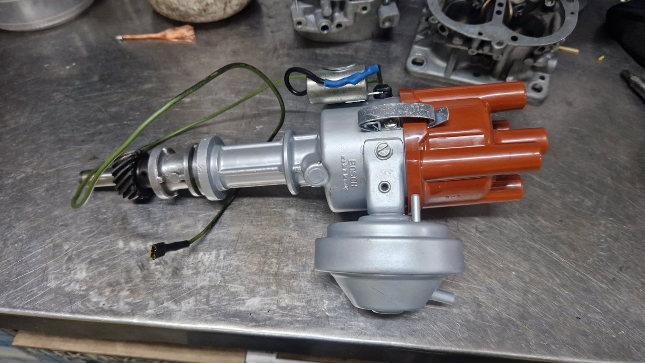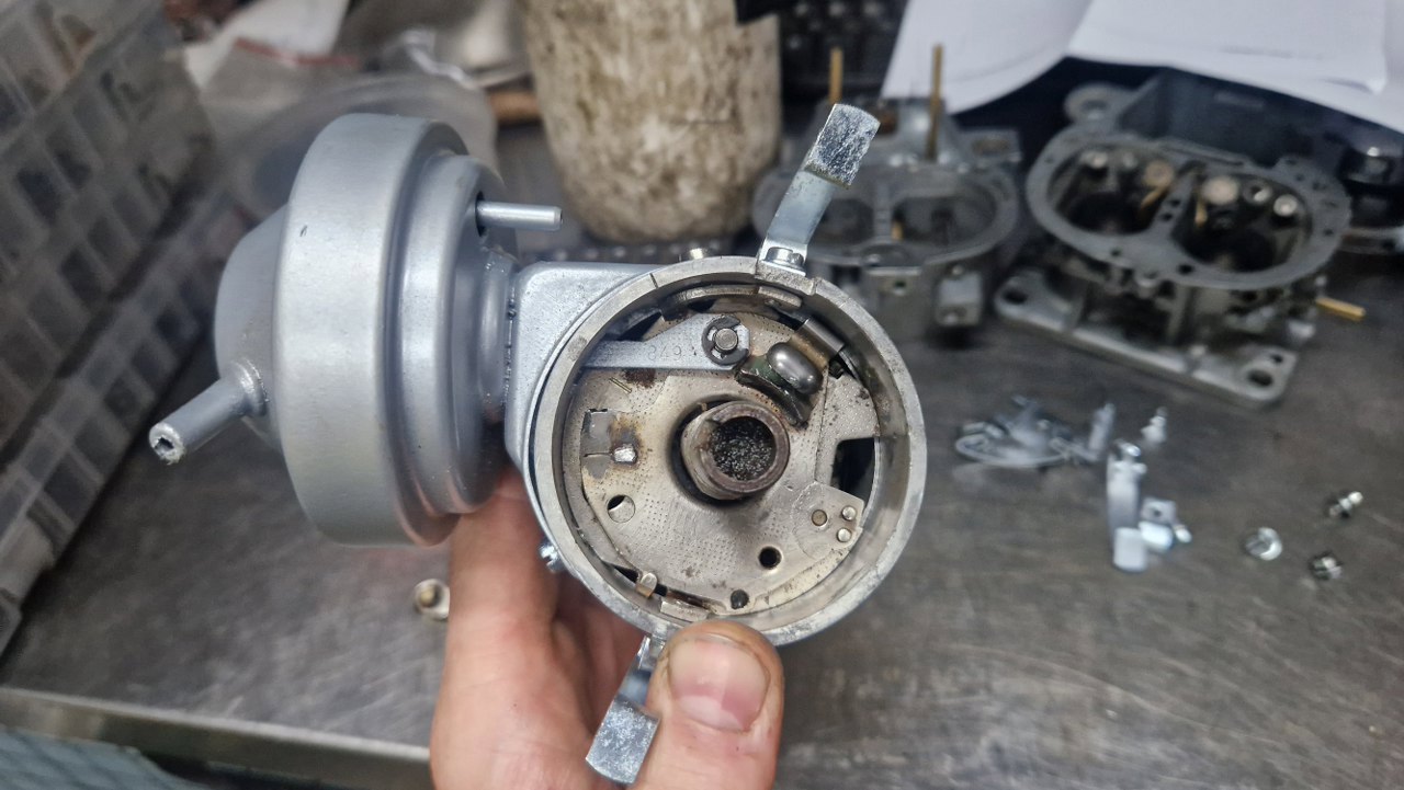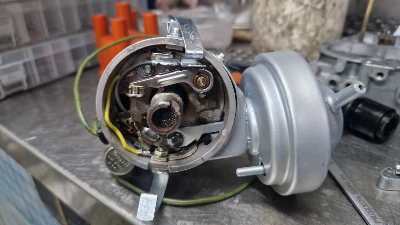 Standardowo w kopułce są przypalone styki, ale nie zrobiłem temu zdjęcia. W środku mechanizmy zapyziałe, ledwo się ruszają. Puszka podciśnienia ma dwa króćce - do opóźniania i przyśpieszania zapłonu. Jedno z nich nie jest używane - i słusznie :).