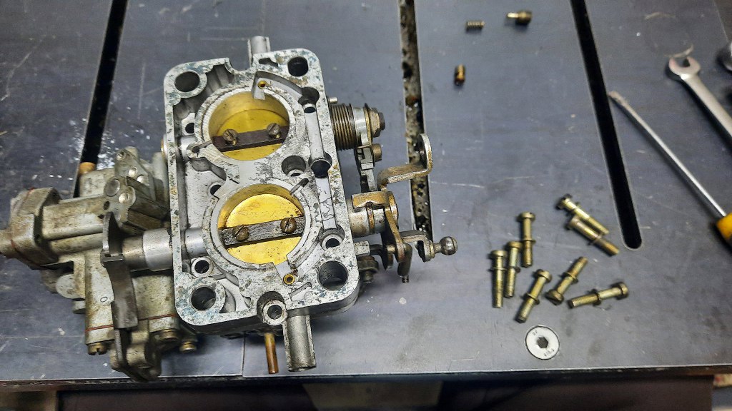 Poluzowałem śruby przepustnic (te na ośkach) i odkręciłem całą płytkę przepustnic od korpusu gaźnika.