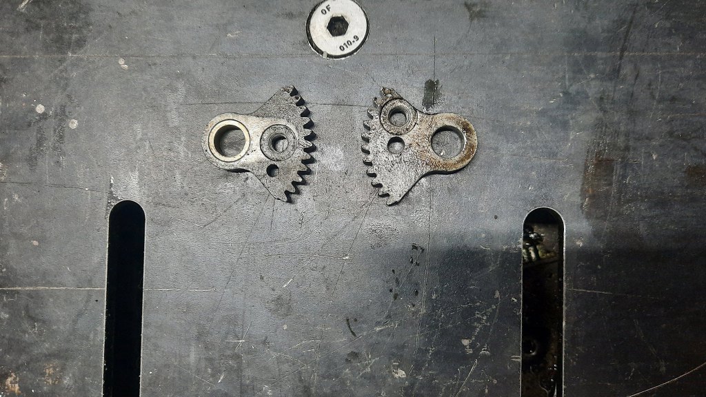 I tu ciekawostka - te gaźniki (EEIT) są symetryczne, czyli przepustnice otwierają się zsynchronizowanie. Służą do tego te zębatki. Wykonane są ze ZnAlu, stopu określanego dość trafnie "gównolitem", bo jest tak słaby. Zazwyczaj te zębatki są wytarte tak, że druga przepustnica otwiera się dopiero jak pierwsza jest już sporo uchylona - dlatego mam wycięte laserem nowe, z nierdzewki. Te natomiast są w stanie idealnym - bez żadnago luzu! Co by chyba obalało teorię tego fachowca, co się nie podjął regeneracji, że gaźnik jest złomem...
