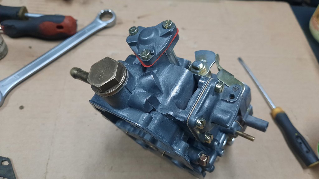 Przykręciłem pokrywę gaźnika do korpusu. Teraz osłona termiczna mechanizmu ssania