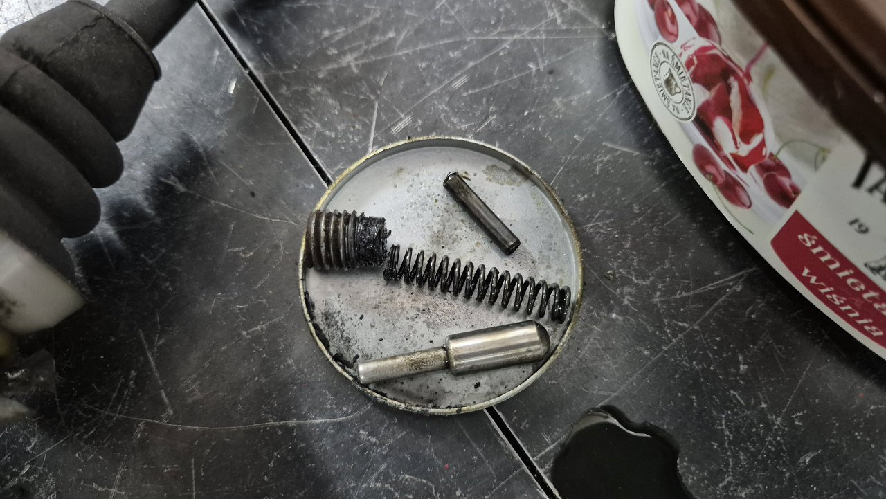 Widać w głębi, że przedni ryjek skrzyni jest odkręcony, a łożysko wysunięte. Ja odkręcam korek trzymający sprężynę i kołek blokujący biegi w odpowiednich pozycjach.