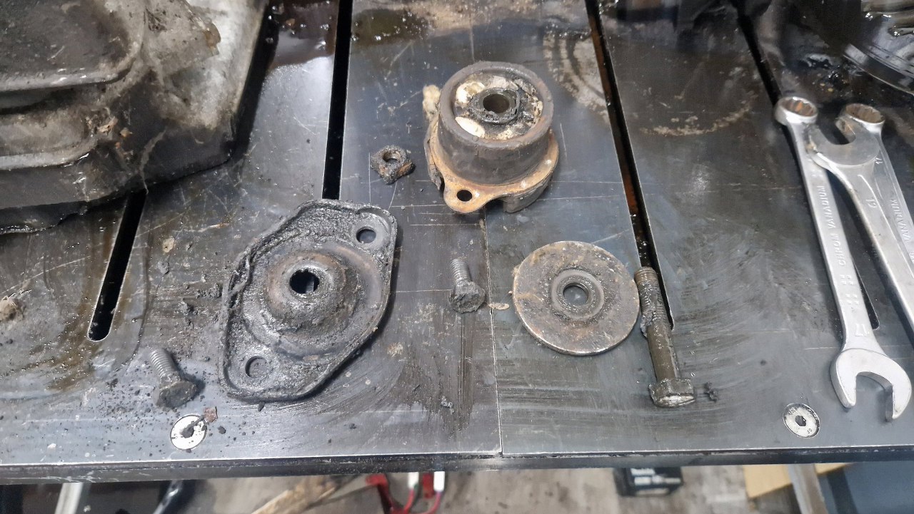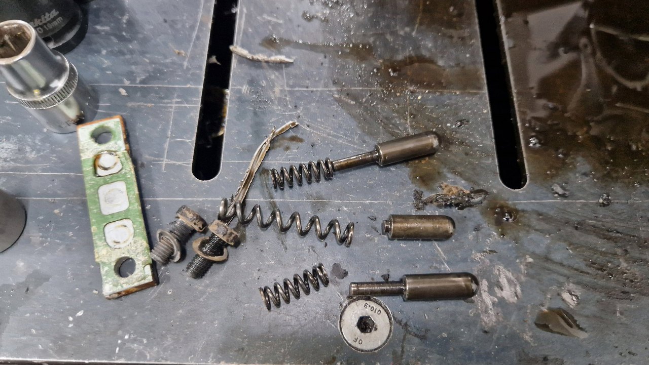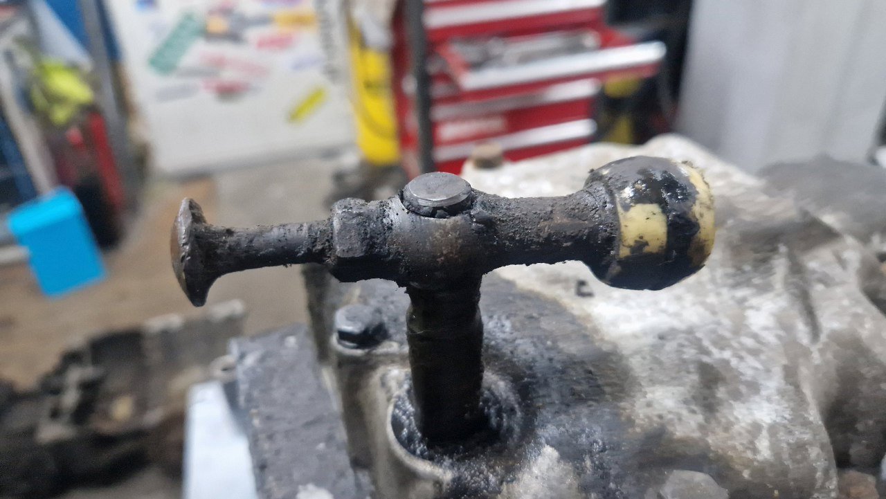 Tu trochę więcej szlamu z oleju. Pośrodku został jeszcze bolec popychający czujnik wstecznego biegu.