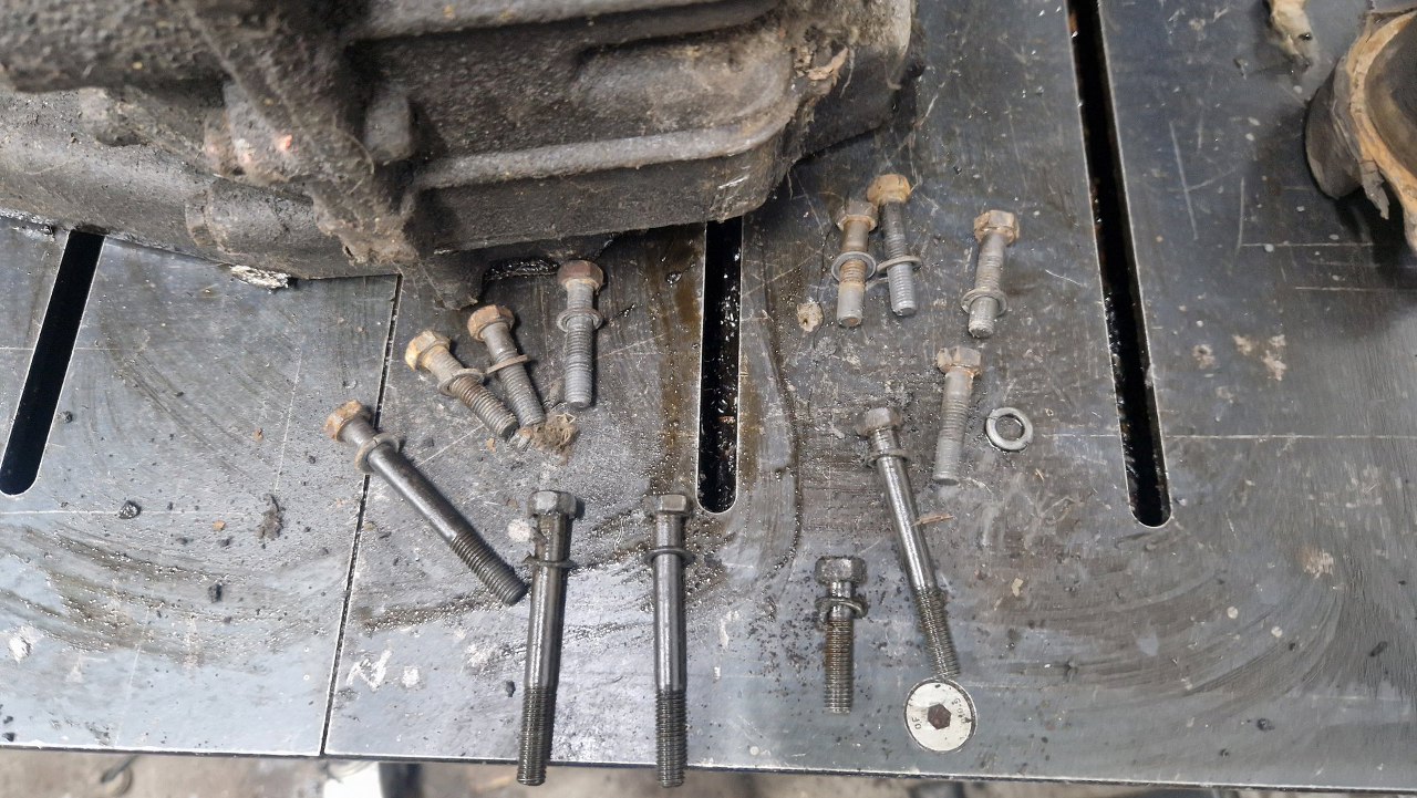 Tylną pokrywę trzyma do korpusu skrzyni trzyma 12 śrub, w czterech różnych długościach. Ech, ci inżynierowie...