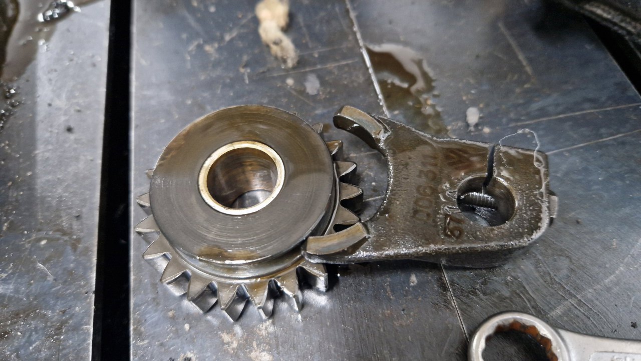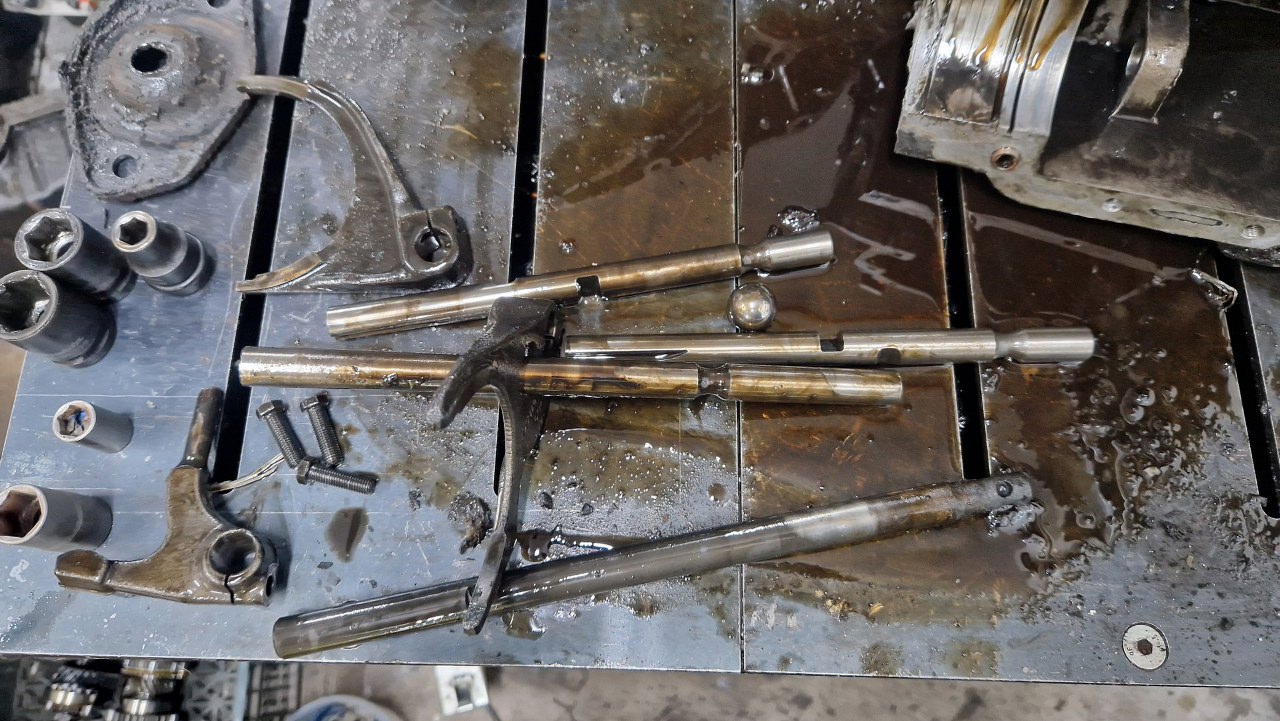 Zostały widełki przesuwające kółka zębate poszczególnych biegów. Ciekawy sposób na blokadę biegów po wrzuceniu dowolnego z nich to ta duża kulka po prawej stronie.
