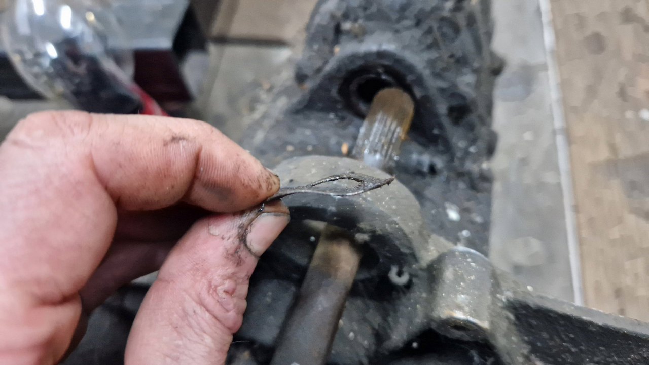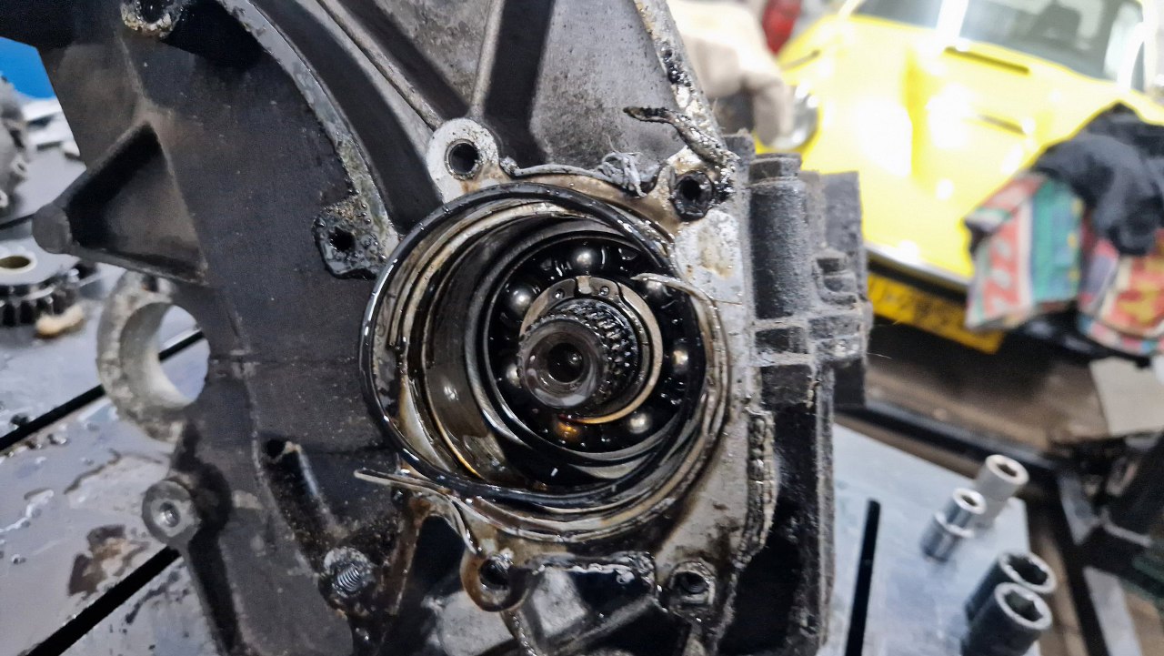 Wspomniałem, że dostałem dwie takie skrzynie na wszelki wypadek. Po dokładnych oględzinach wałka sprzęgłowego przy wejściu do skrzyni widzę, że była tu podkładka stalowa zabezpieczona w obudowie pierścieniem Segera (tu został z niego jedynie nędzny ogryzek). Podejrzewam, że drugi pierścień był na wałku i całość blokowała wałek sprzęgłowy przed nadmiernym wsunięciem do skrzyni.