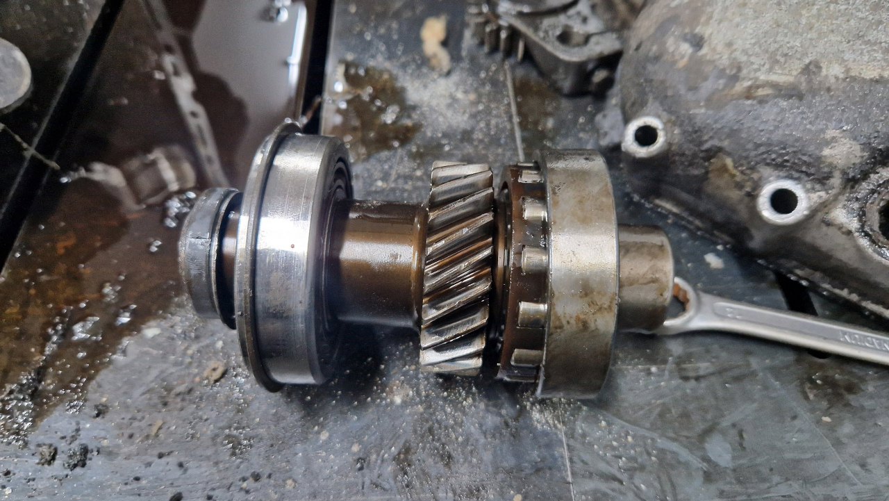 A tu wałek wejściowy. Bardzo krótki, on tylko przekazuje napęd na wałek pośredni. Ciekawe łożysko wałeczkowe.