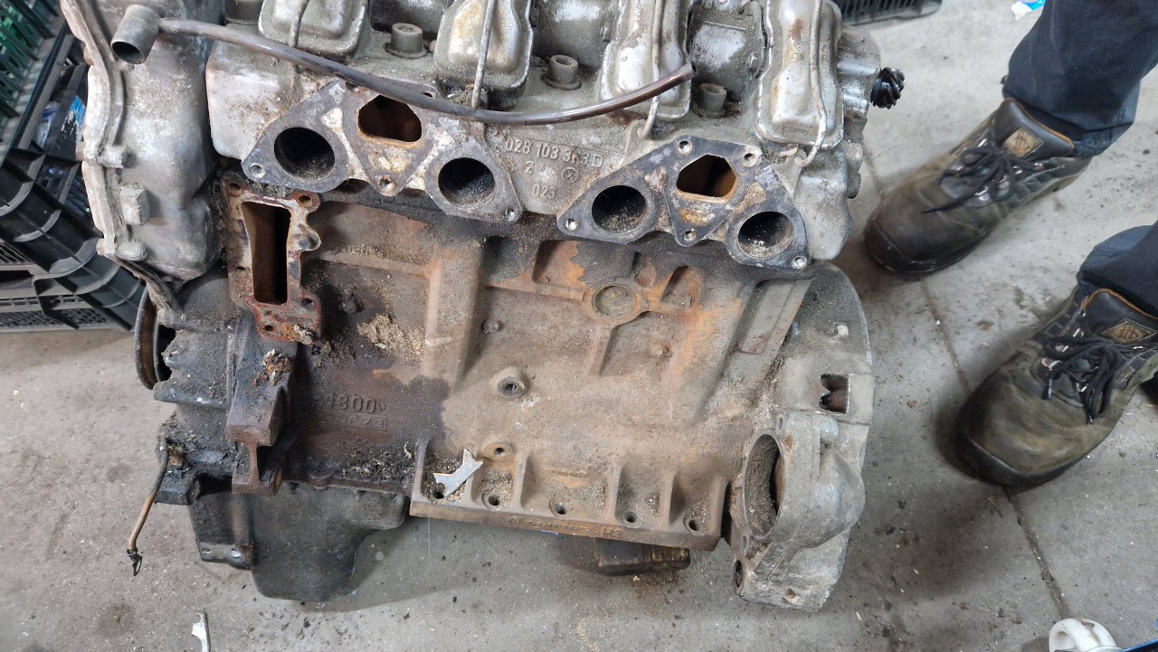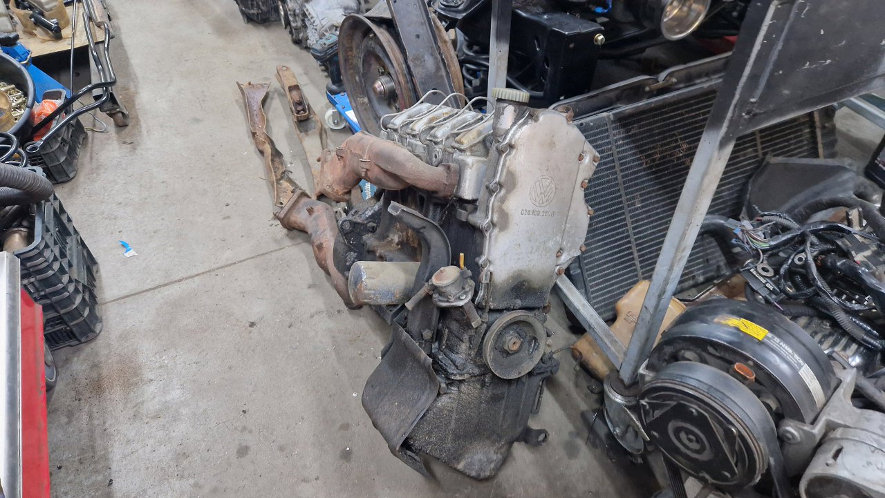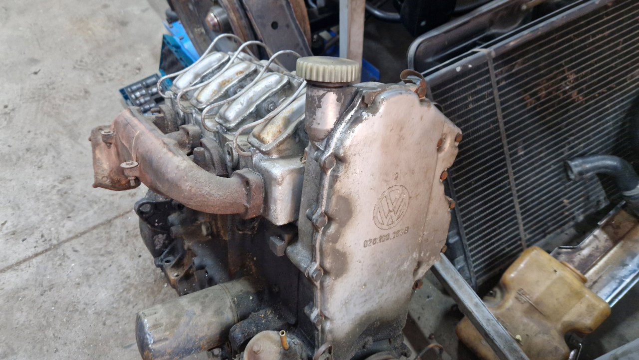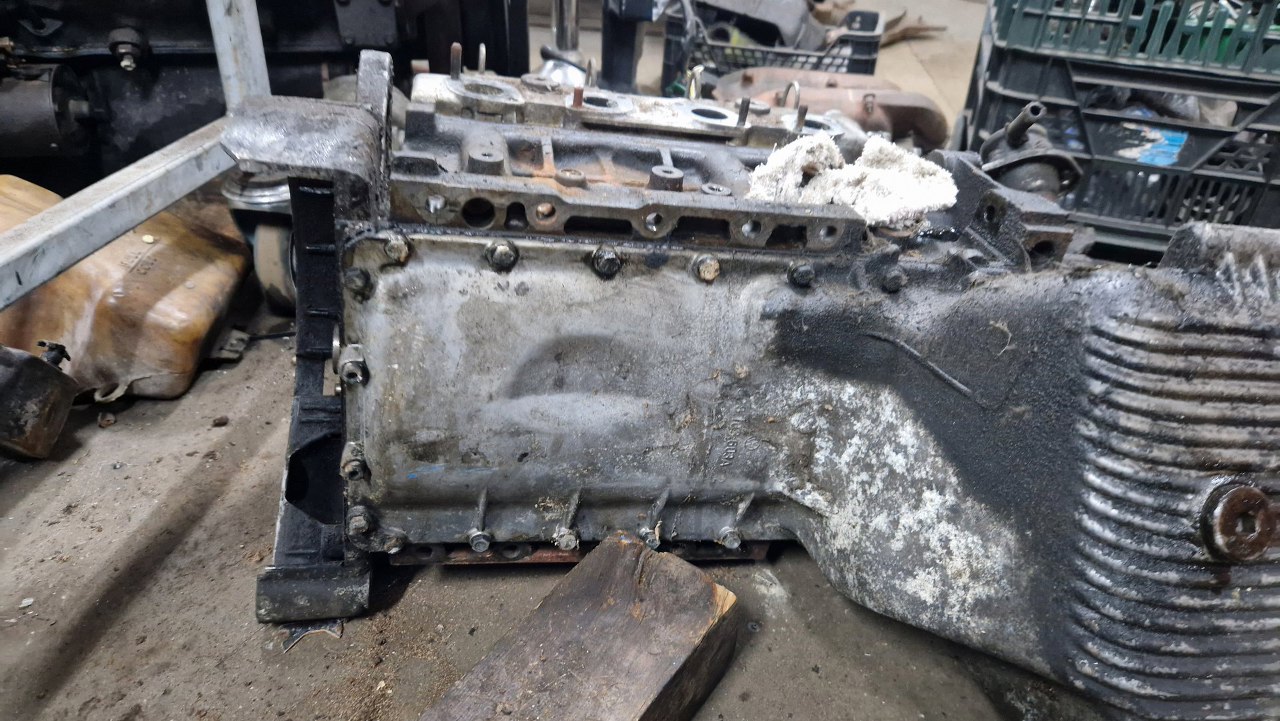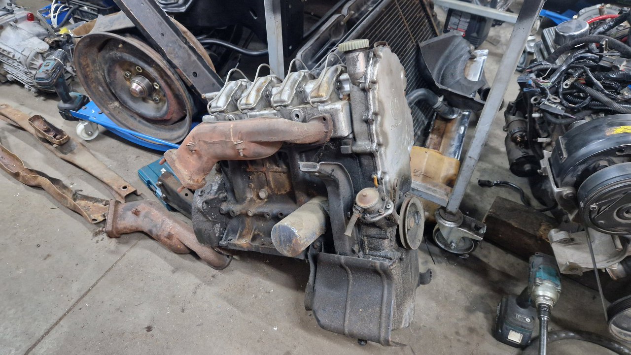 Silnik, po przykręceniu do skrzyni jest dość mocno pochylony. Dlatego teraz stoi oparty o warsztat. To jest akurat 1.8 z końca produkcji K70, wcześniejsze były 1.6. W ogóle K oznacza Kolben, czyli tłoki, bo wcześniejsze RO80 oznaczało silnik Wankla (rotary). Liczba to zdaje się moc, ale nie dam sobie nic uciąć za to :).
